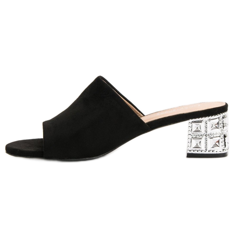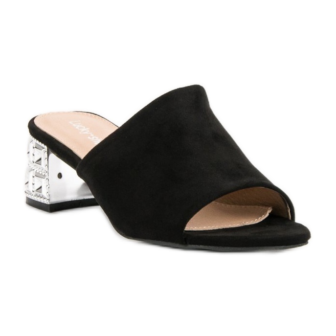Découvrez l'élégance et le confort des mules à talons hauts en daim noir de Lucky Shoes. Ces chaussures classiques pour femmes sont la combinaison parfaite de style et de confort qui attireront certainement l'attention. Le talon argenté de 5,5 cm richement décoré leur confère un caractère unique et en fait un accessoire tendance dans de nombreux styles décontractés et élégants.