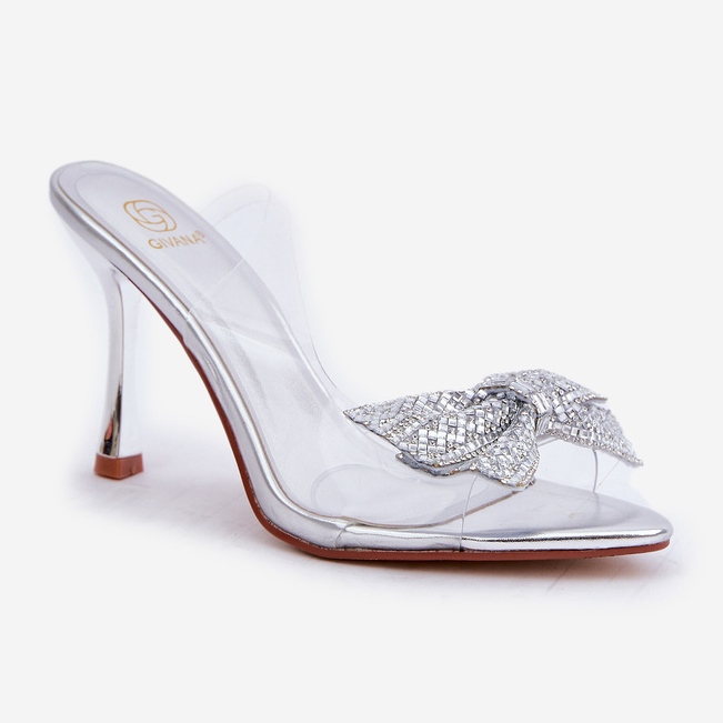 Détails: Sandales à talons hauts argentées transparentes avec un nœud argenté brillant