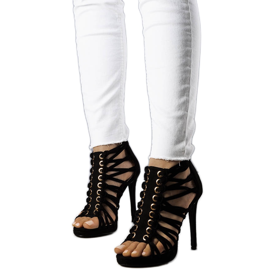 Les sandales élégantes, féminines et sensuelles - Pompis sont une proposition qui complètera chaque soirée. Les épingles classiques et minces d'une hauteur de 11,5 cm façonnent magnifiquement la figure, et la plate-forme subtile et un insert doux en cuir écologique garantissent un plus grand confort de port. Le haut en cuir écologique en daim dans une couleur noire classique et des détails ouverts donnent aux chaussures la légèreté et l'élégance. Le modèle est fermé avec un verrou pratique, ce qui facilite la configuration.