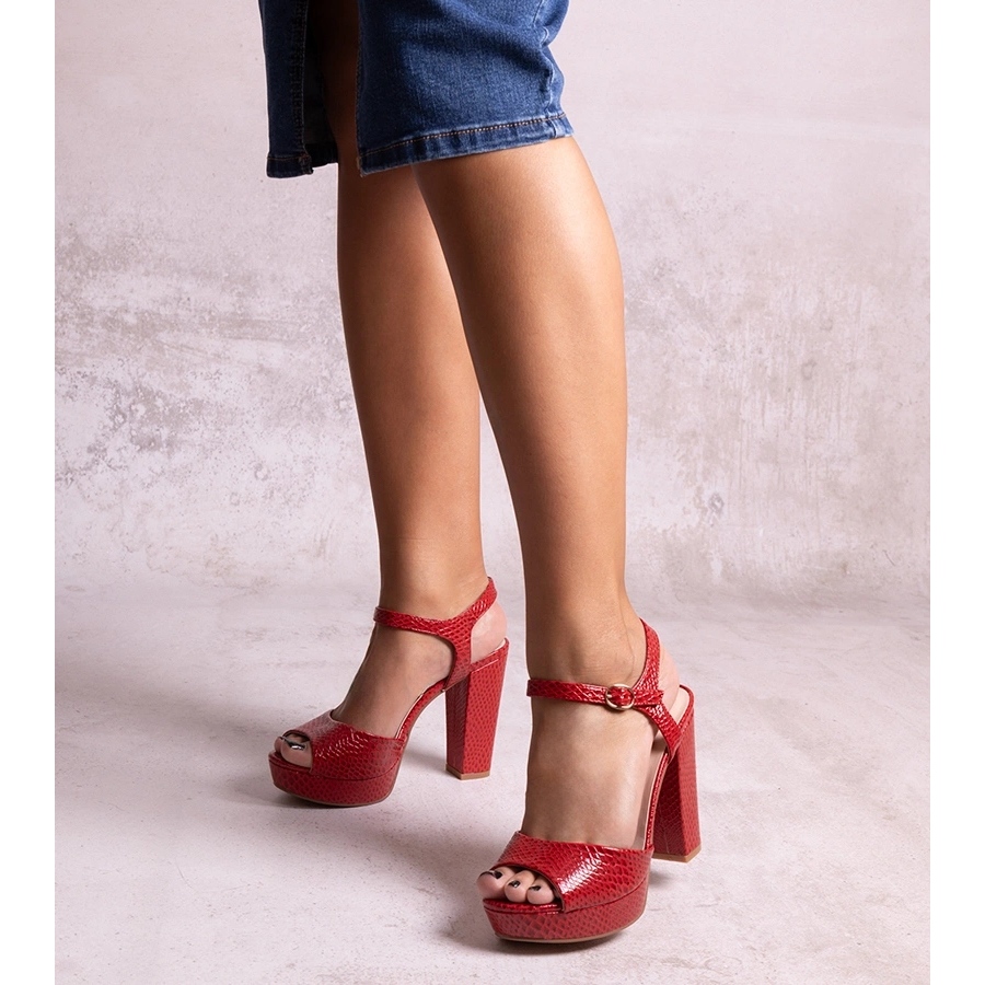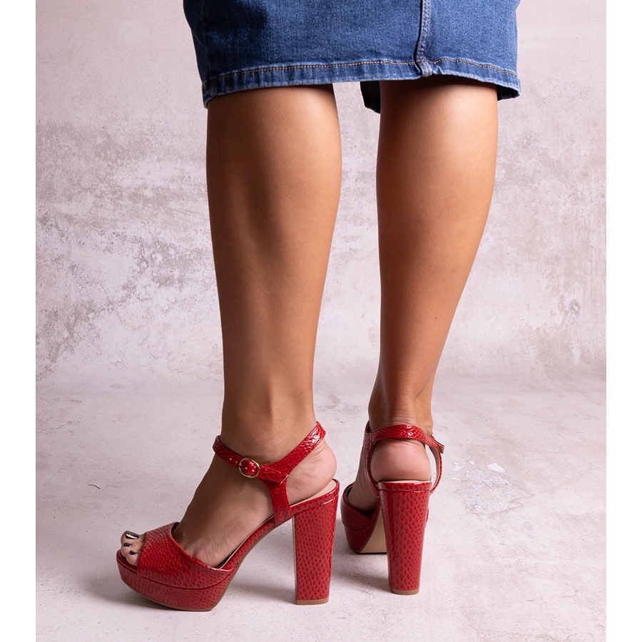 Découvrez le style inhabituel et l'élégance avec des sandales rouges sur le poteau avec le motif de peau du serpent Nidia. Ces chaussures expressives sont un excellent choix pour les jours d'été que vous voulez passer dans le confort et la mode. Fabriqués en cuir écologique de haute qualité et en plastique, ils combinent un prix abordable avec un style de mode.
