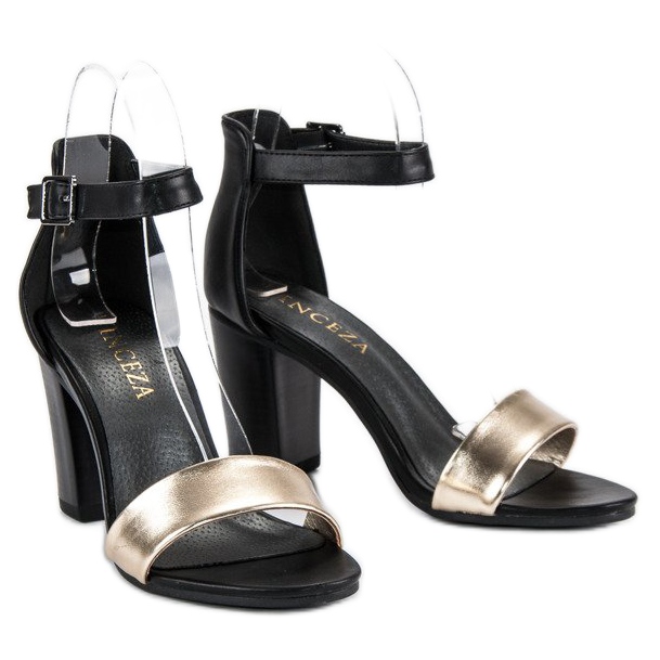 Les élégantes sandales à talons hauts VINCEZA en noir et or sont un choix parfait pour les femmes qui souhaitent allier confort et design à la mode. Fabriquées en éco-cuir, ces sandales élégantes se distinguent par une bride métallique sur le devant, ajoutant un caractère unique. Grâce au talon intégré et à la fermeture à boucle réglable autour de la cheville, les chaussures s'adaptent parfaitement au pied, garantissant stabilité et confort.