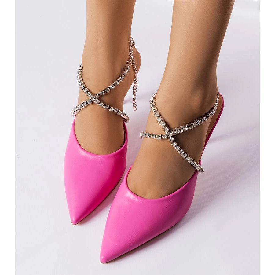 Les tongs roses à talons hauts sont des chaussures élégantes pour femmes d'un fabricant appelé la marque Inna. Les talons hauts se caractérisent par un talon fin de 10 cm et un bout pointu qui mettent joliment en valeur les jambes. Ils sont entièrement fabriqués en cuir écologique d'une couleur rose tamisée, définie par le fabricant comme Pink. La semelle des chaussures est en plastique beige, tandis que la semelle intérieure est également en cuir écologique. Les tongs ont un talon ouvert, ce qui ajoute du style et de l'efficacité.
