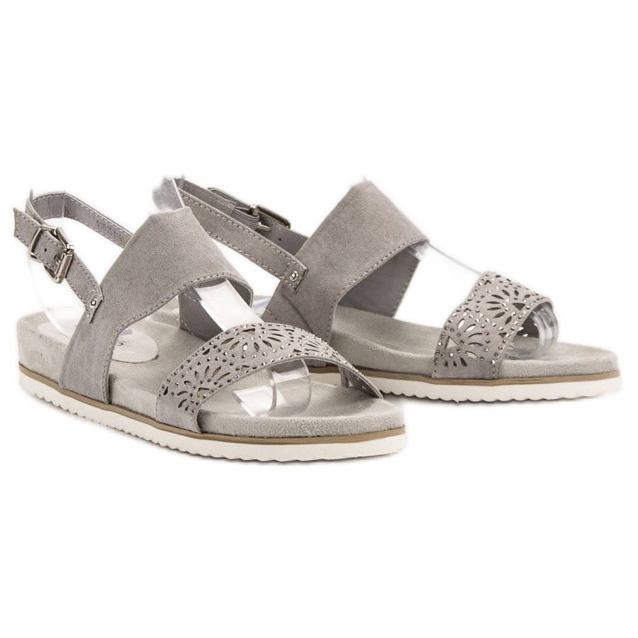 Fabriquées en cuir suédé écologique de haute qualité et d'une couleur grise tendance, ces sandales sont non seulement esthétiques, mais également respectueuses de l'environnement. Le charme des cristaux qui décorent le modèle ajoute de l'élégance et permet de les combiner facilement avec des tenues de tous les jours ou plus formelles.