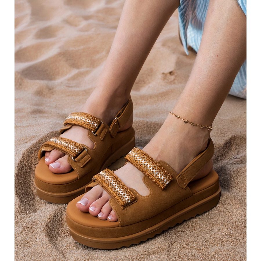 Découvrez le charme des journées d'été avec des sandales au caramel avec des rayures brodées sur la plate-forme. Ces chaussures uniques à Camel Shade sont une combinaison parfaite de confort et de style, idéal pour les femmes qui veulent enrichir leur garde-robe avec des accents élégants.