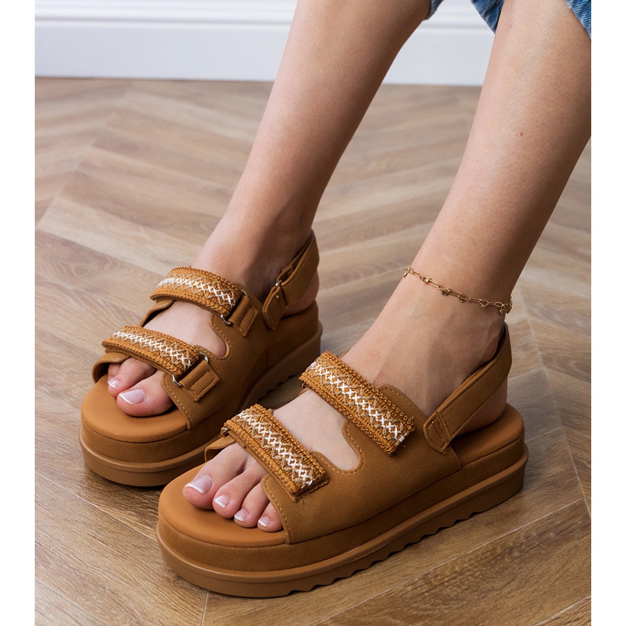 Détails: Sandales au caramel avec des rayures brodées sur la plate-forme brun
