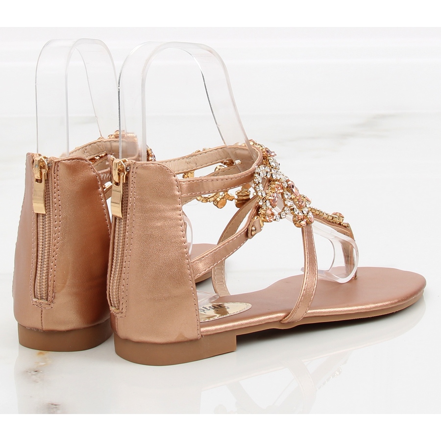 Des sandales féminines brillantes décorées de pierres chatoyantes dans une nuance de shampooing - idéal pour les stylisations d'été et élégantes. Un modèle avec une coupe plate classique (hauteur 1,5 cm) et une attache de verrouillage pratique à l'arrière, ce qui garantit une mise en place et de la stabilité confortables pendant les longues promenades. Supérieur en cuir écologique, semelle en plastique.