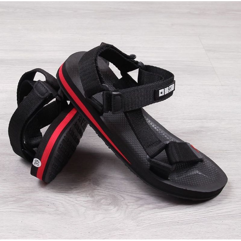 Sandales Big Star Int1173a - noir, sports et confortable pour l'été. Une tige textile légère et textile avec un motif élégant avec le logo du fabricant et une fixation fermeture scratch réglable assure un peu d'ajustement et de mise en place rapide. L'insert en mousse doux et la semelle plate (environ 2 cm) garantissent le confort quotidien pendant les promenades dans la ville, les voyages et les activités de style de style de vie d'été.