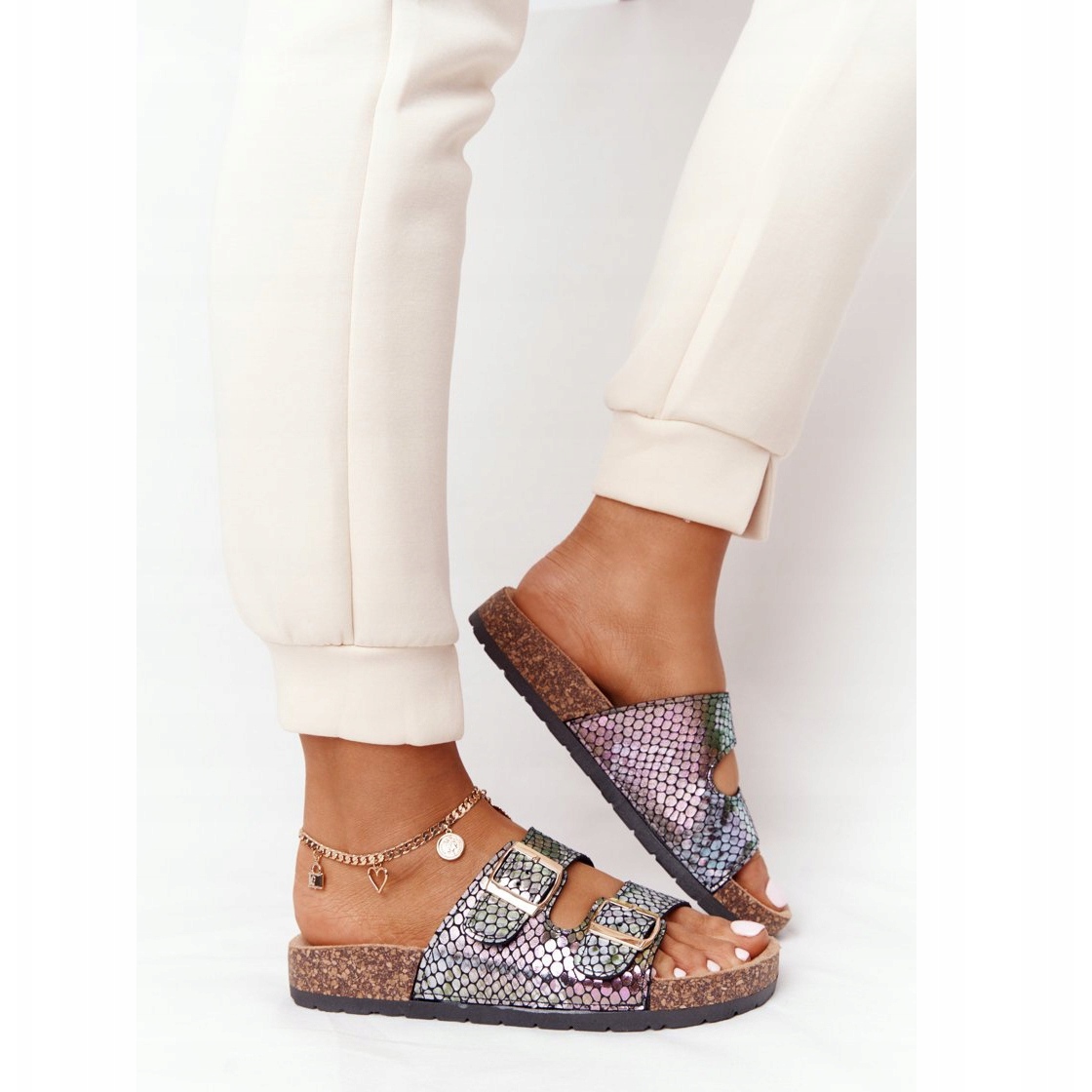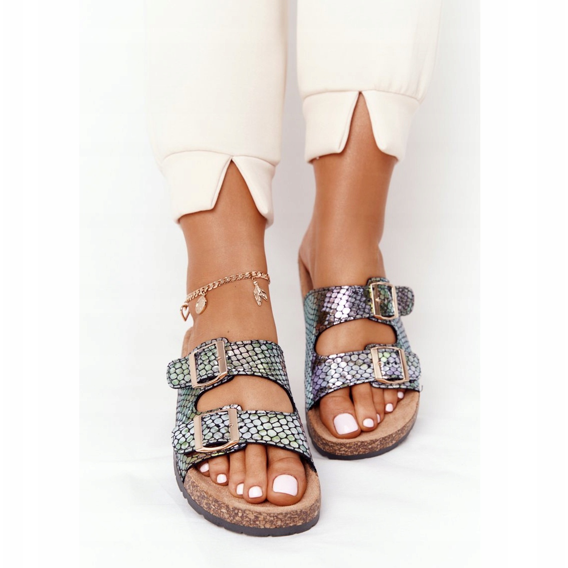 Découvrez la mode et le confort en un : les tongs MSMG avec une semelle en liège noires et multicolores sont le choix parfait pour les journées d'été ! Ces tongs pour femmes uniques présentent un motif serpent irisé original qui ajoutera de l'énergie à n'importe quel style. La semelle intérieure profilée assure un confort de port, vous pouvez donc les emporter partout avec vous - pour une promenade, au travail ou en vacances.
