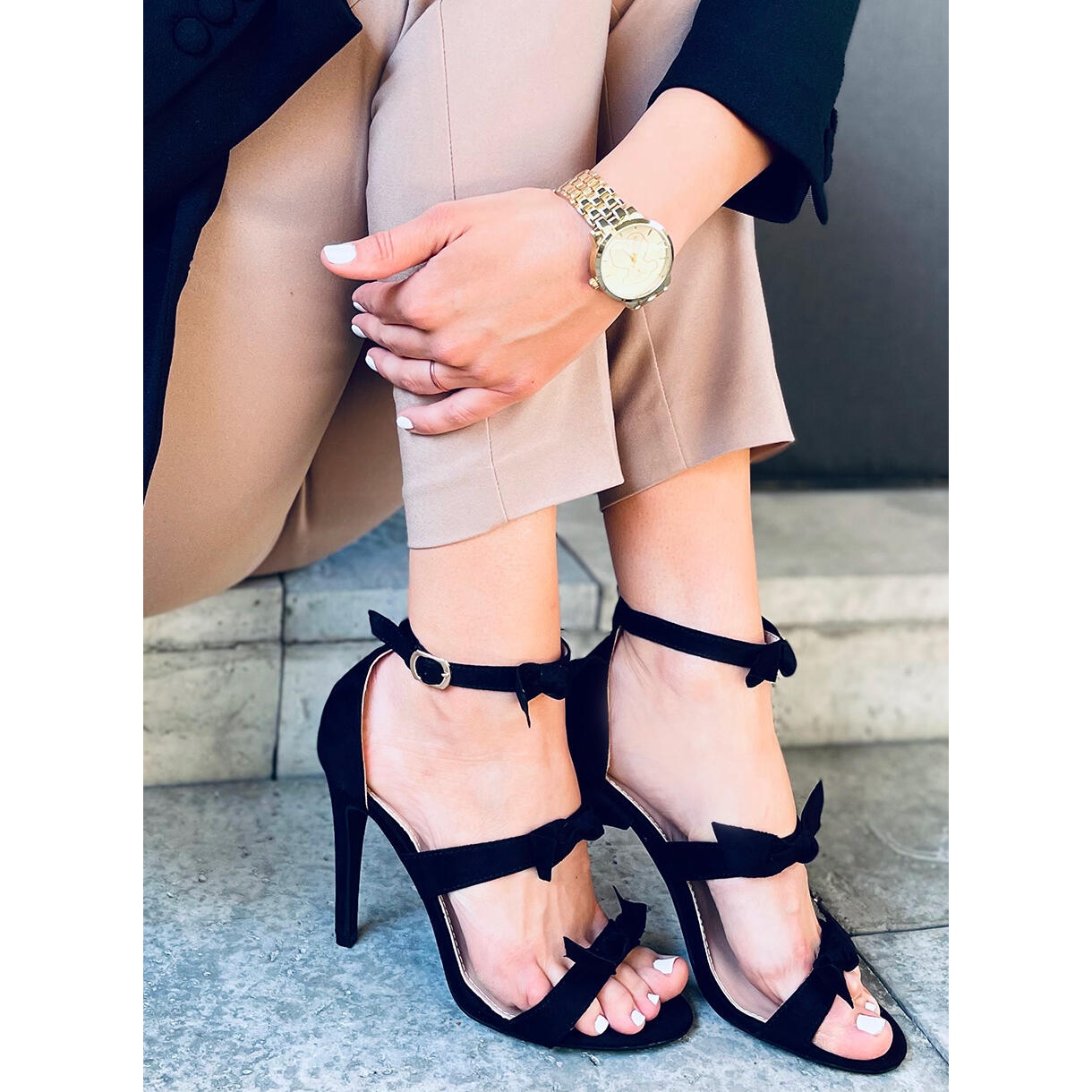 Un talon aiguille haut de 10,5 cm rend les pieds incroyablement sûrs d'eux, tout en soulignant leur féminité. Les nœuds sensuels ajoutent du charme et la couleur noire lisse permet aux sandales de s'adapter parfaitement à une variété de tenues, aussi bien au quotidien que pour des occasions spéciales.