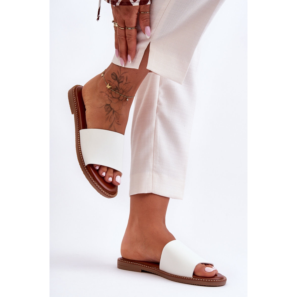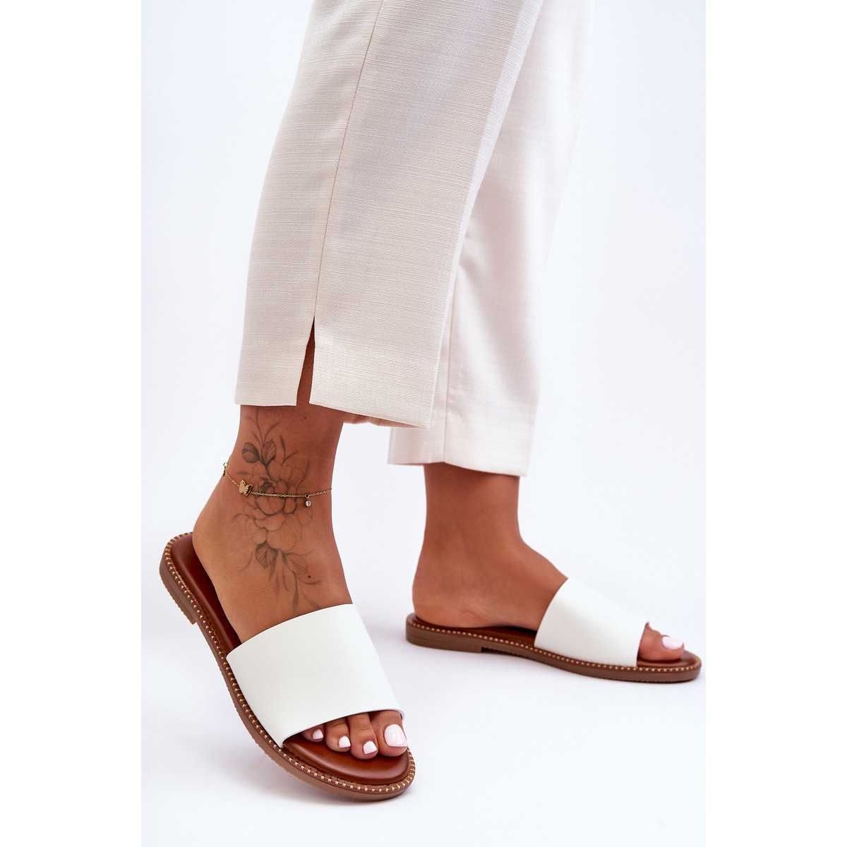 Les pantoufles Classic Women's White Aphrodite sont des pantoufles élégantes pour femmes en cuir écologique. Dotées d'un talon plat de 2 cm de haut et d'une semelle en plastique, elles apportent confort et stabilité. Les tongs sont blanches avec une décoration dorée supplémentaire et une semelle marron. Ils ont également une semelle intérieure douce pour un confort de port.