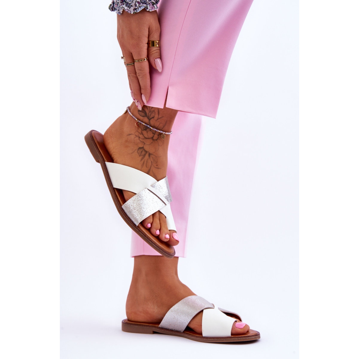 Nous vous présentons les tongs Nancy blanches et argentées classiques pour femmes - le choix parfait pour les journées d'été ! Ces tongs élégantes, fabriquées en éco-cuir de haute qualité, allient élégance et confort, ce qui en fait un complément parfait à tout style estival.