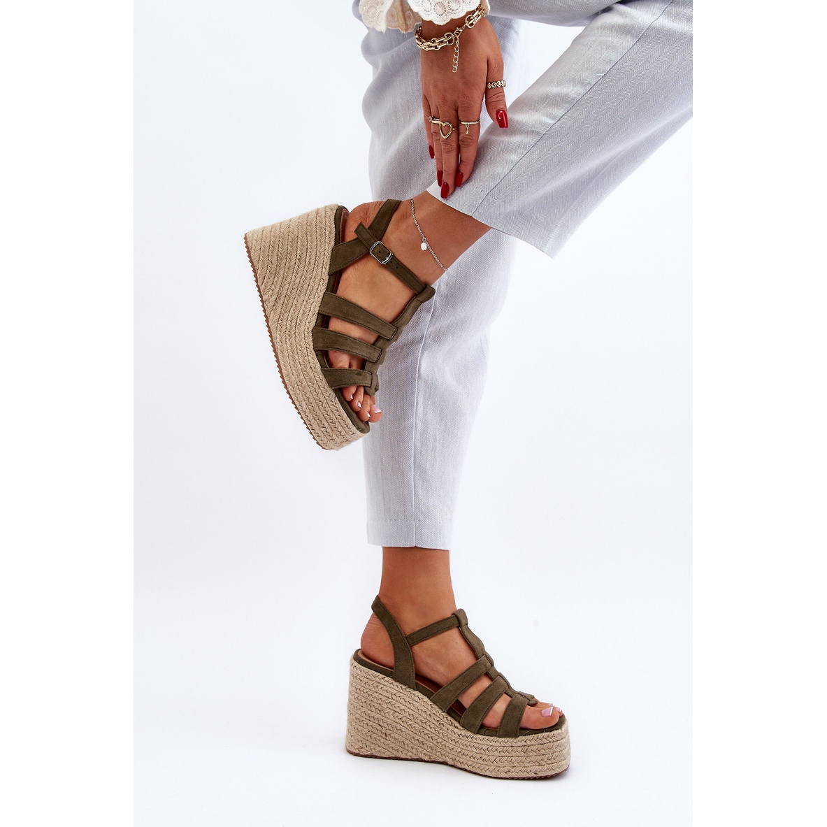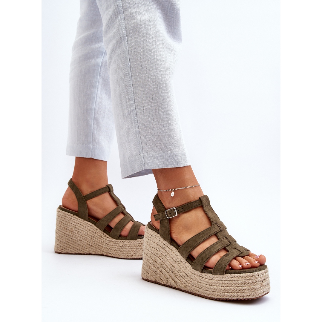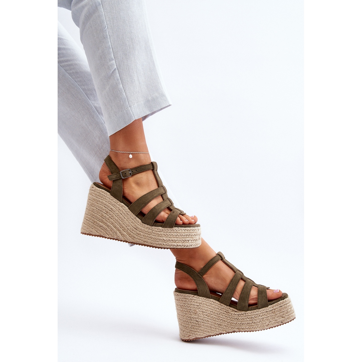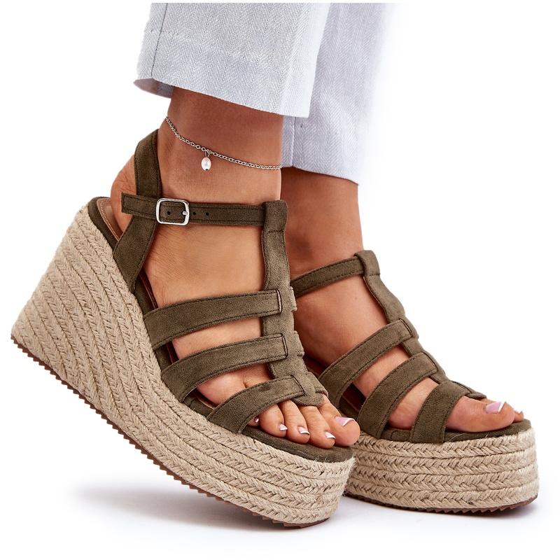 Attachées avec une ceinture réglable avec une boucle, ces sandales ne collent pas seulement aux pieds, mais permettent également un ajustement individuel, ce qui garantit un confort de port encore plus important. La coupe classique d'espadrilles en combinaison avec une teinte verte modérée fera que les sandales correspondent à de nombreuses stylisations d'été - des robes aux shorts.