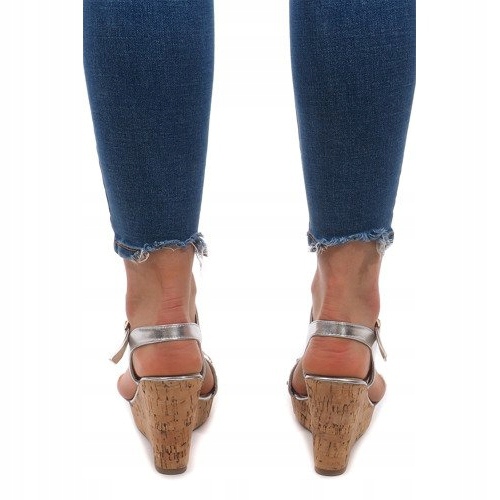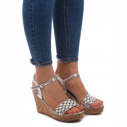 La hauteur du coin de 9,5 cm permet un minceur subtil de la silhouette, et une petite plateforme à l'avant assure un confort de port tout au long de la journée. Les sandales sont fermées par une boucle, ce qui permet un ajustement parfait au pied. Un avantage supplémentaire réside dans les nombreux strass sur le devant, qui confèrent à la chaussure un caractère unique et une expression tendance.