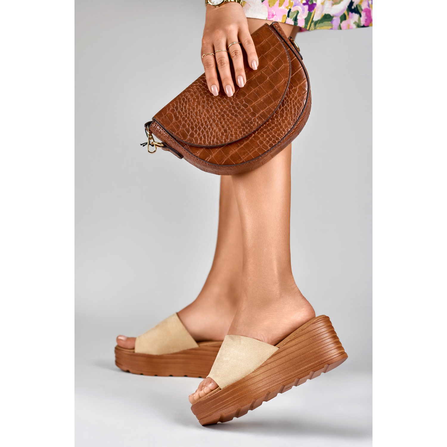 Les tongs sont conçues pour les femmes, pour un usage quotidien. Leur couleur beige est universelle et s'intégrera parfaitement dans de nombreux styles. La tige est en daim écologique et le matériau extérieur est également en cuir suédé écologique. La semelle est en matière synthétique.