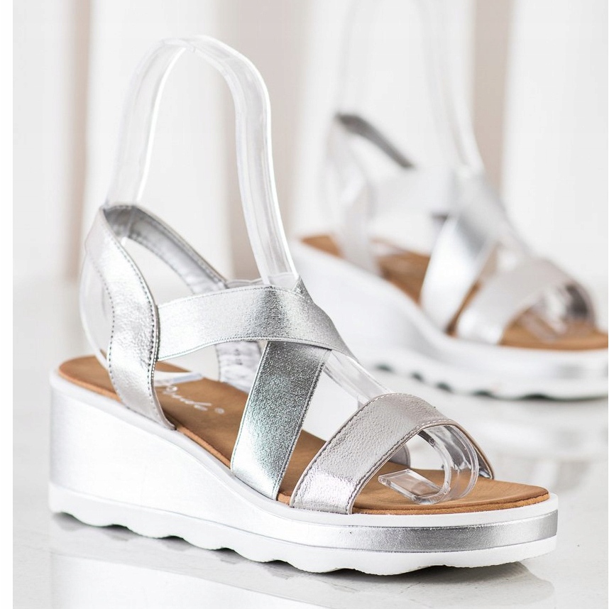 Les sandales compensées Weide en argent sont un modèle unique qui attirera l'attention et ajoutera de la brillance à n'importe quel style. Leur surface brillante s'adapte parfaitement aux tendances actuelles, ce qui en fait un excellent choix pour les femmes qui apprécient le design unique.