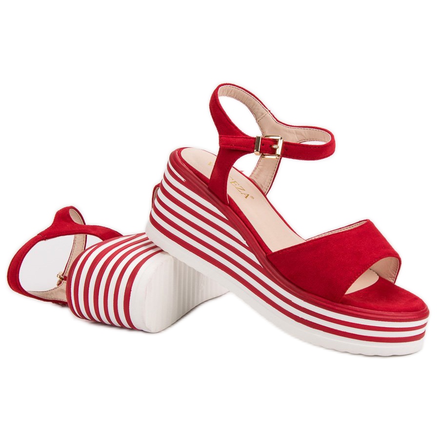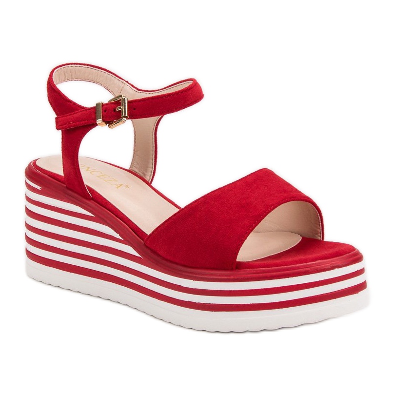 Découvrez des sandales compensées uniques de la marque Vinceza dans un coloris rouge intense, qui deviendront un élément irremplaçable de votre garde-robe printemps-été. Ces chaussures élégantes avec un talon compensé original à rayures blanches et rouges, de 8 centimètres de haut, allient design tendance et confort de port.