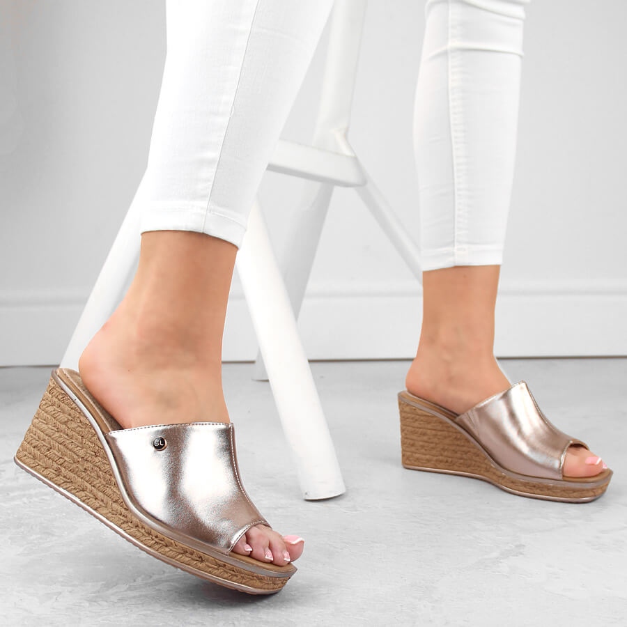Fabriquées en cuir écologique à l'extérieur et en cuir véritable naturel à l'insert, les tongs assurent un confort de port même pendant de longues heures. Grâce à leur conception à enfiler, l'enfilage et le retrait des chaussures sont extrêmement faciles et rapides, ce que toutes les femmes actives apprécieront certainement. La hauteur du coin de 8 cm ajoute de la légèreté et allonge optiquement les jambes, et l'éclat métallique se marie bien avec différents styles - du décontracté au plus élégant.