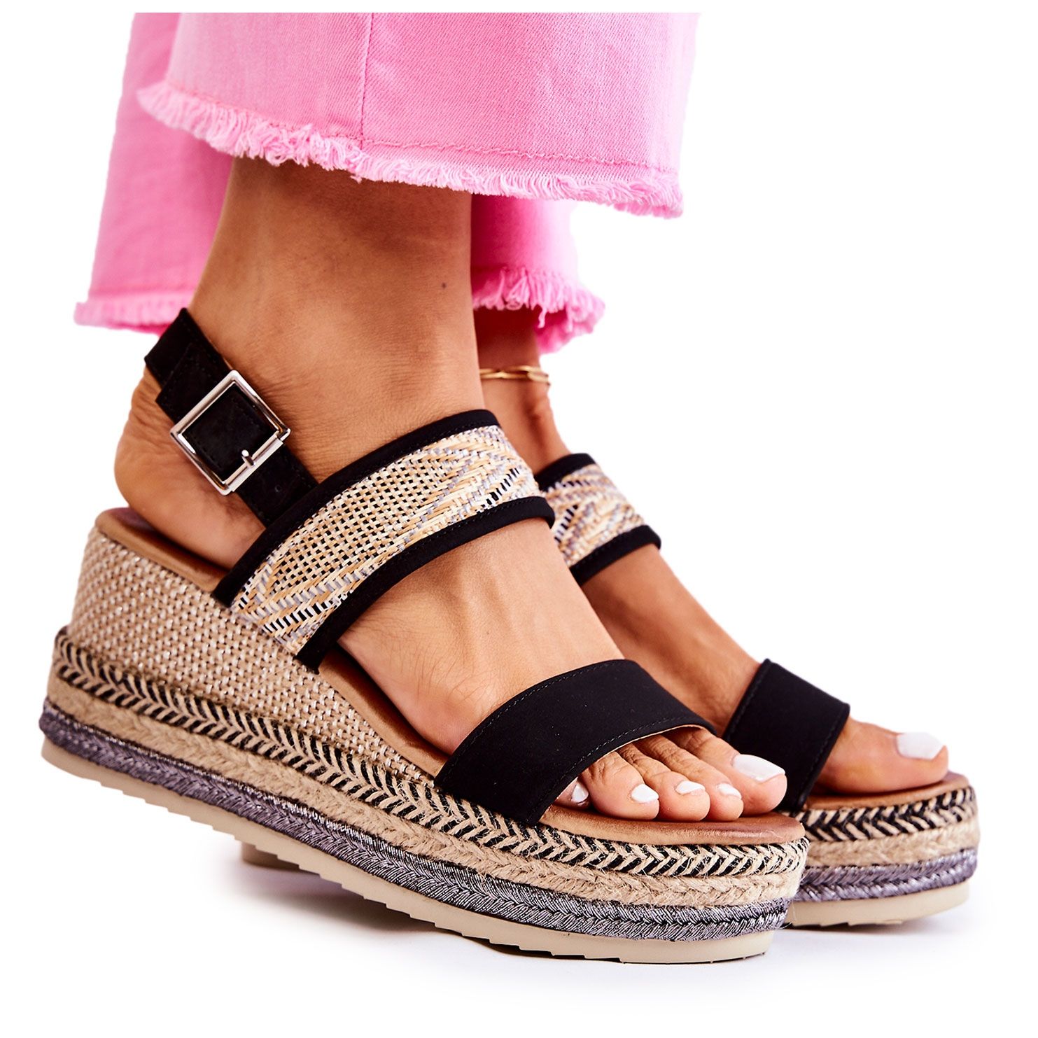 Les sandales se ferment grâce à une boucle située au niveau de la cheville, ce qui permet un ajustement parfait au pied. La cale ornée de trois lanières tressées de différentes couleurs ajoute un caractère unique aux sandales. La semelle antidérapante assure la stabilité, ce qui est particulièrement nécessaire lors des journées chaudes lorsque nous passons du temps à l'extérieur.