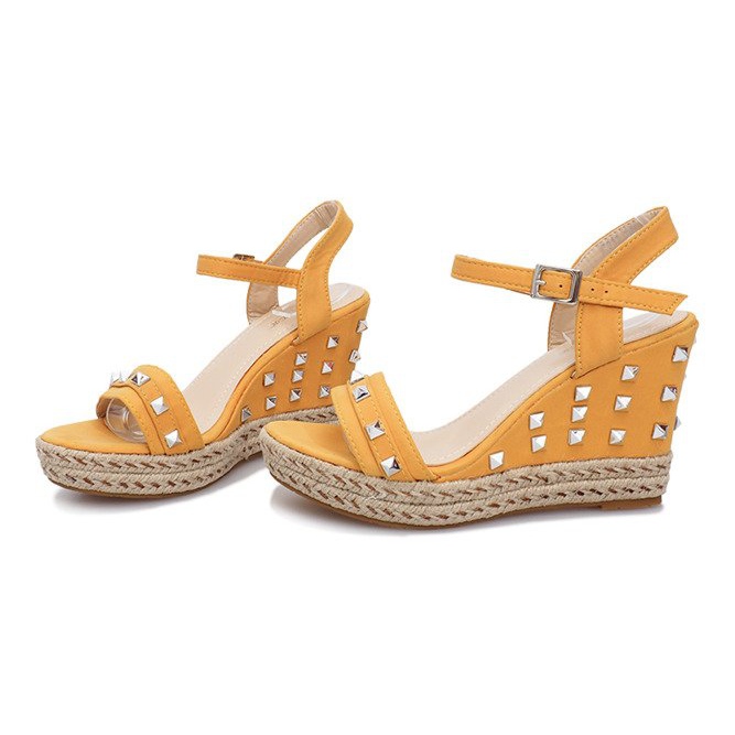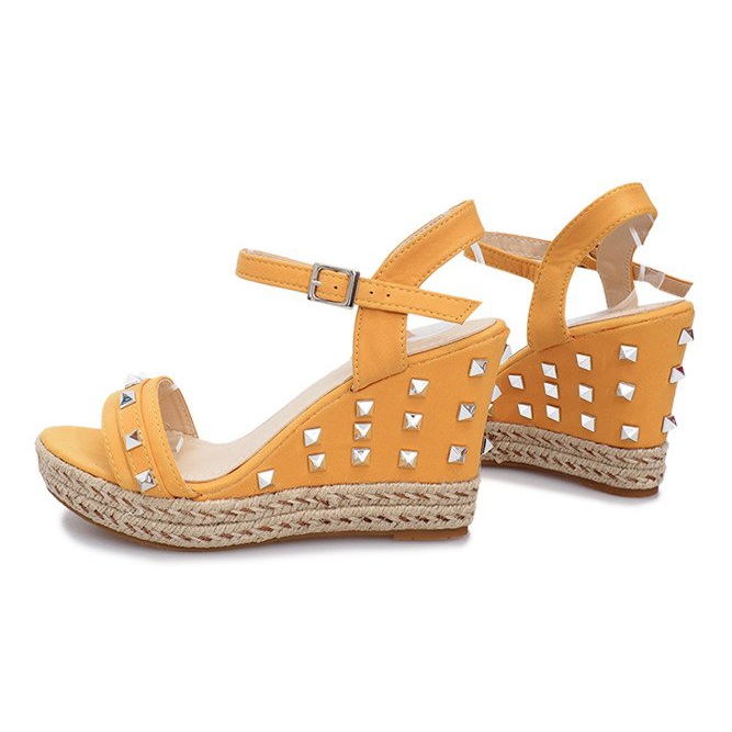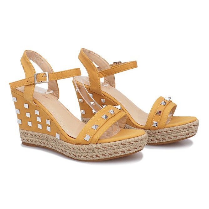 Découvrez le style et le confort avec les sandales compensées à clous jaunes de Khloe ! Ces chaussures uniques avec des coins compensés de 10 centimètres attireront certainement l'attention et ajouteront du caractère à n'importe quel style. Equipés d'une plateforme de 2,5 cm à l'avant, ils offrent un confort de marche, parfait pour les journées chaudes.