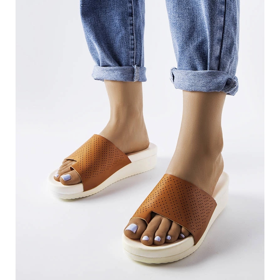 La couleur de ces chaussures est une teinte chaude de marron, nommée par le fabricant "Camel". Ils conviennent à de nombreux styles et sont un excellent ajout aux stylisations estivales. La semelle des chaussures est blanche, en caoutchouc, ce qui assure confort et durabilité. La particularité de ces tongs est l'absence de toe box, ce qui leur donne une ambiance ample et décontractée.