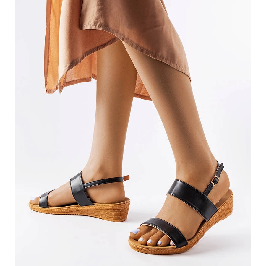 Sandales de coin classiques et confortables, parfaites pour les jours d'été. Une forme lisse et élégante dans une couleur noire universelle va bien avec les stylisations quotidiennes et plus élégantes. Un coin de 4 cm de haut assure la stabilité et le soulèvement doucement sans renoncer au confort.