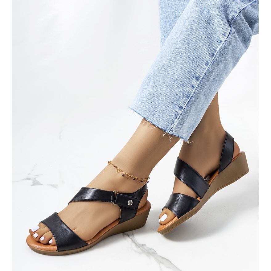 Les sandales compensées noires Souttar sont un choix parfait pour les journées d'été, qui ajouteront de l'élégance et un caractère unique à votre style. Des chaussures confortables, fabriquées en cuir écologique de haute qualité, assurent un confort de port tout au long de la journée. Grâce à la semelle intérieure souple, même les longues promenades ne posent aucun problème.