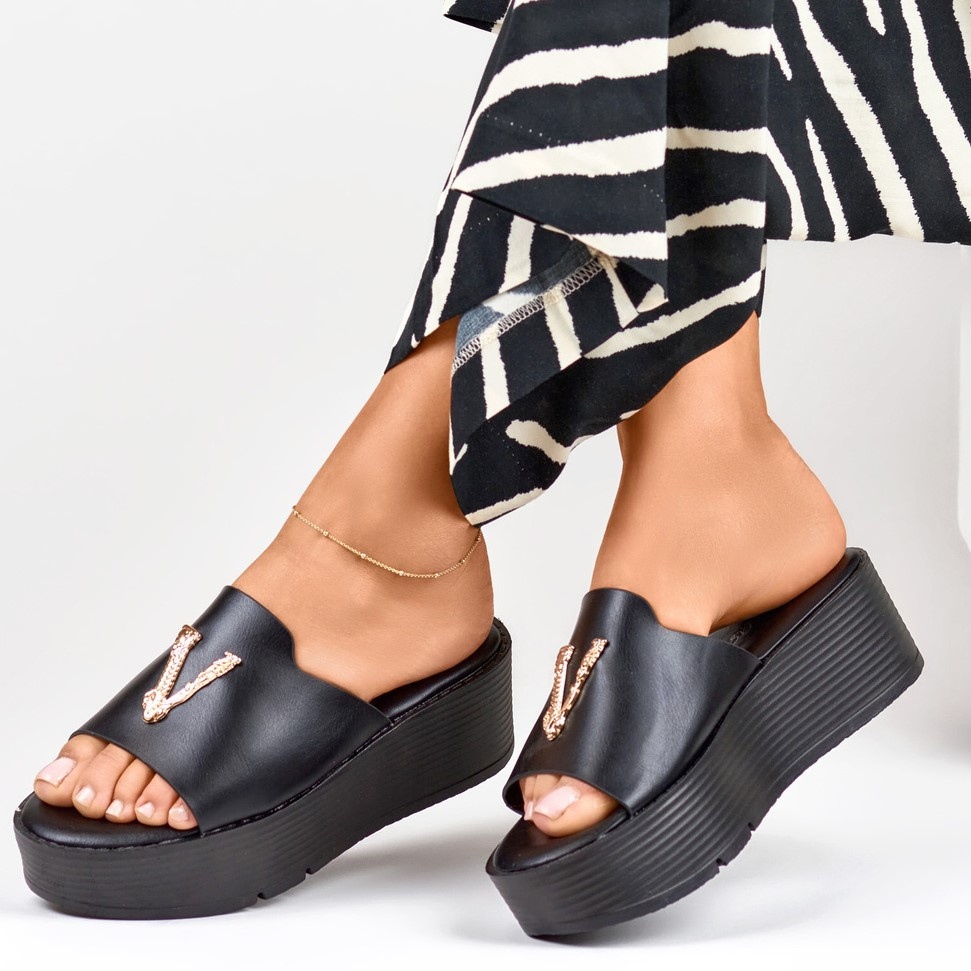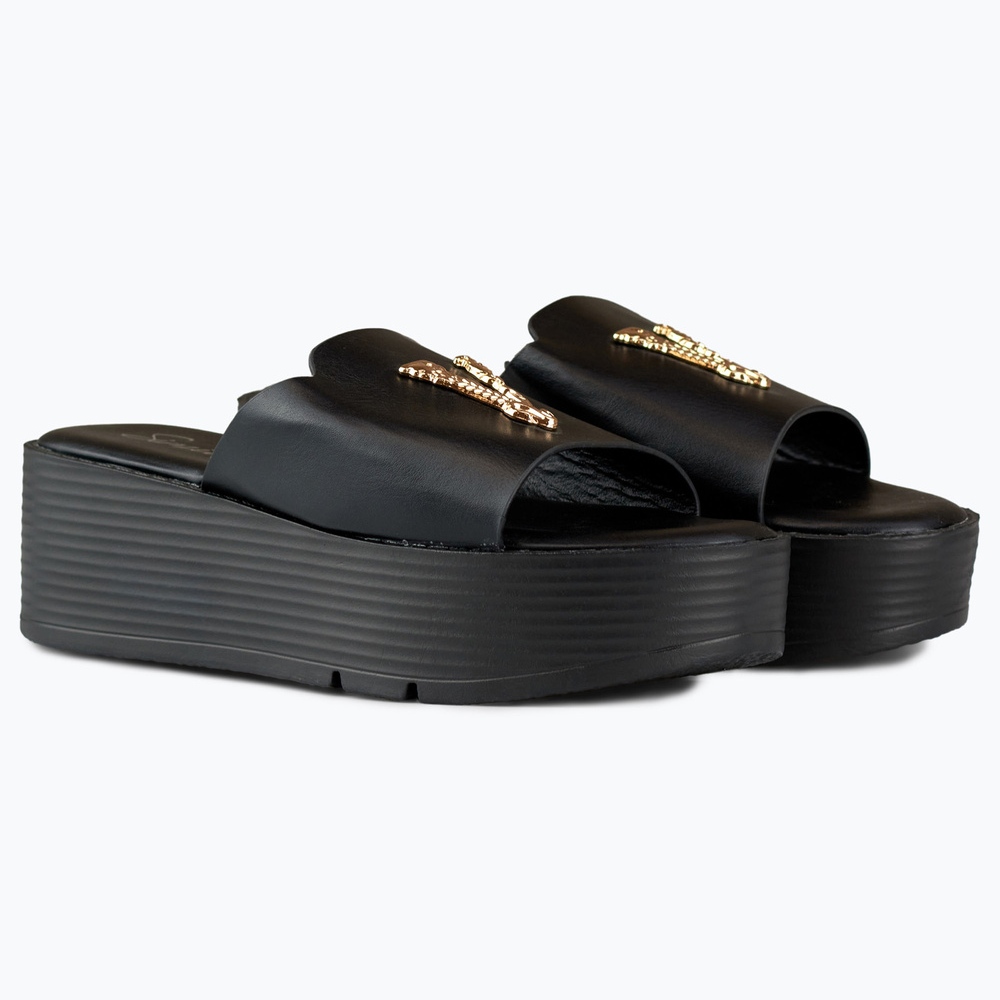 Détails: Sandales compensées noires pour femme avec décoration dorée le noir