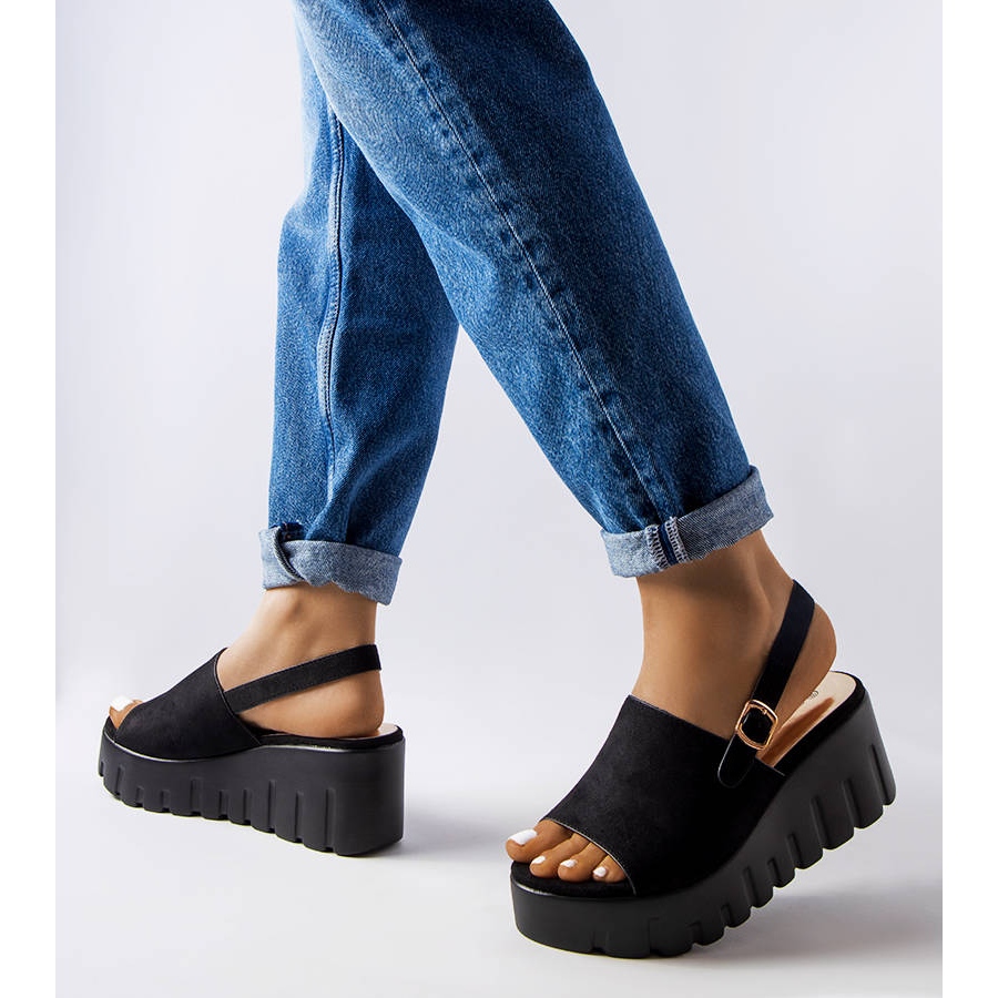 Fabriquées en cuir suédé écologique de haute qualité, ces sandales compensées offrent non seulement une durabilité, mais conservent également leur aspect élégant pendant longtemps. La semelle en caoutchouc noir est robuste et flexible, offrant traction et sécurité à chaque pas. Le design sans motifs supplémentaires en noir classique est intemporel et facile à assortir à tout type de garde-robe, ce qui rend ce modèle extrêmement universel.