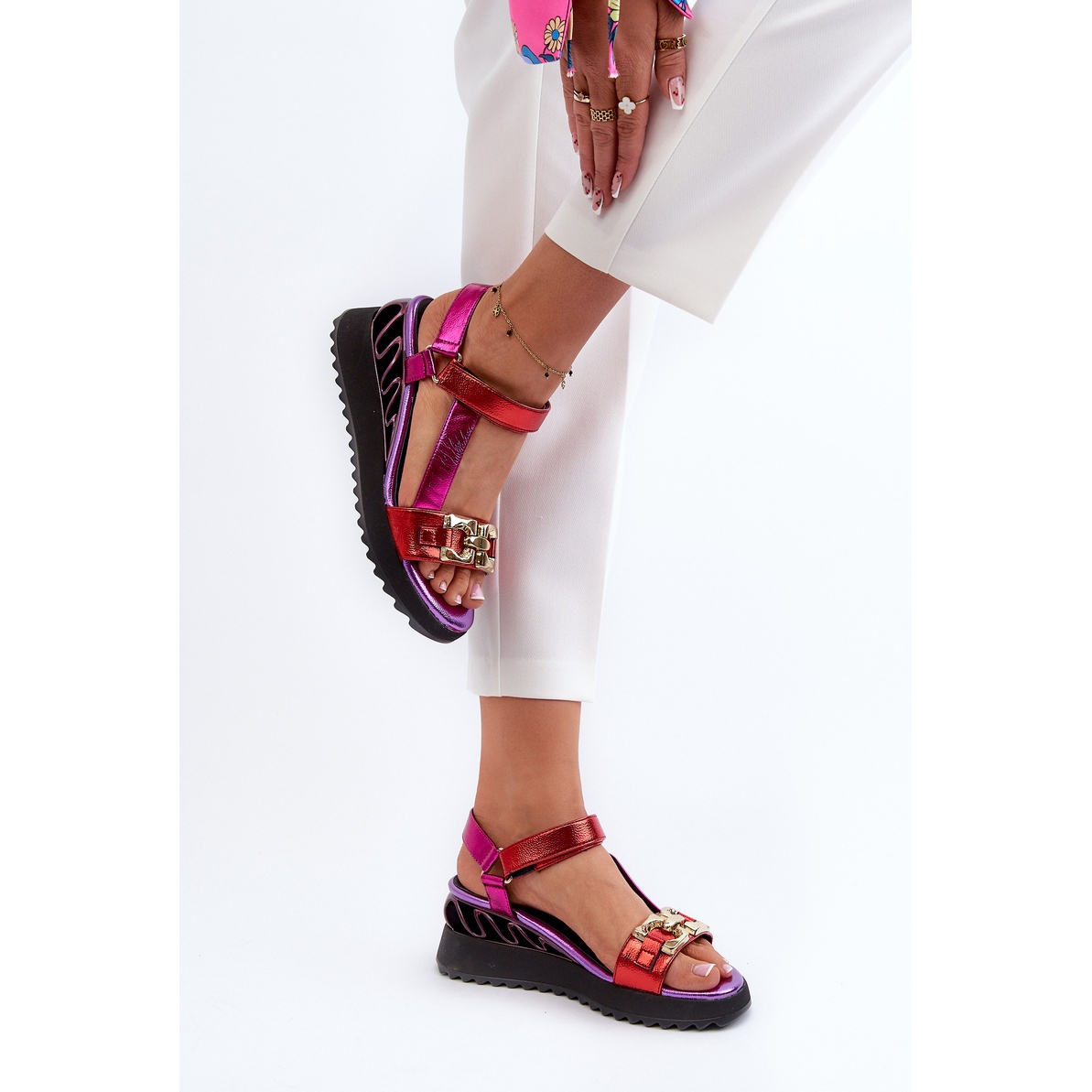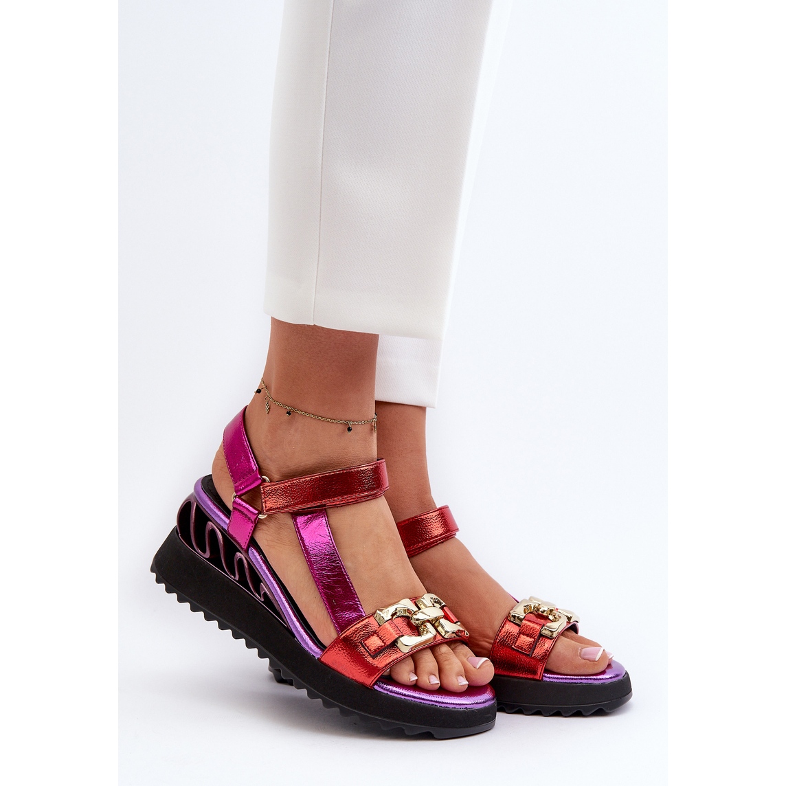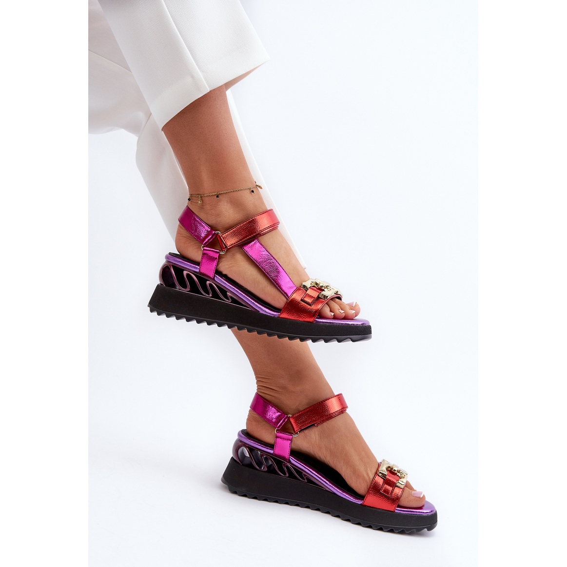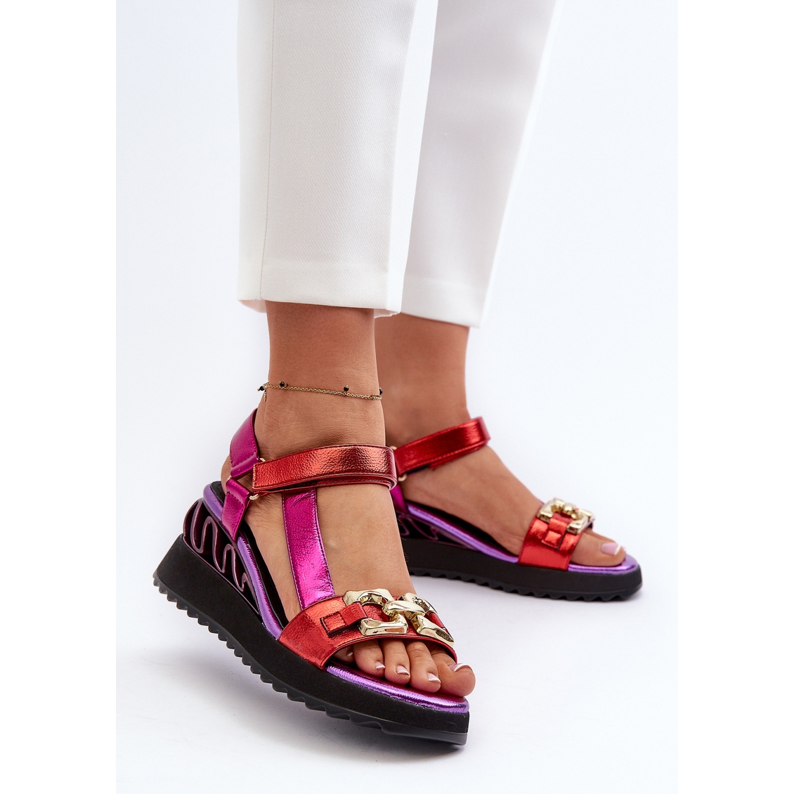 La hauteur du coin de 6,5 cm ajoute la légèreté à la figure, tout en offrant la stabilité et la liberté de mouvement. La couleur violette avec des accents rouges métalliques attire l'œil et donne le caractère de toute stylisation.