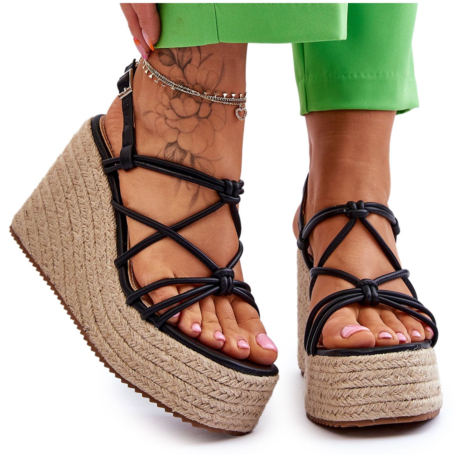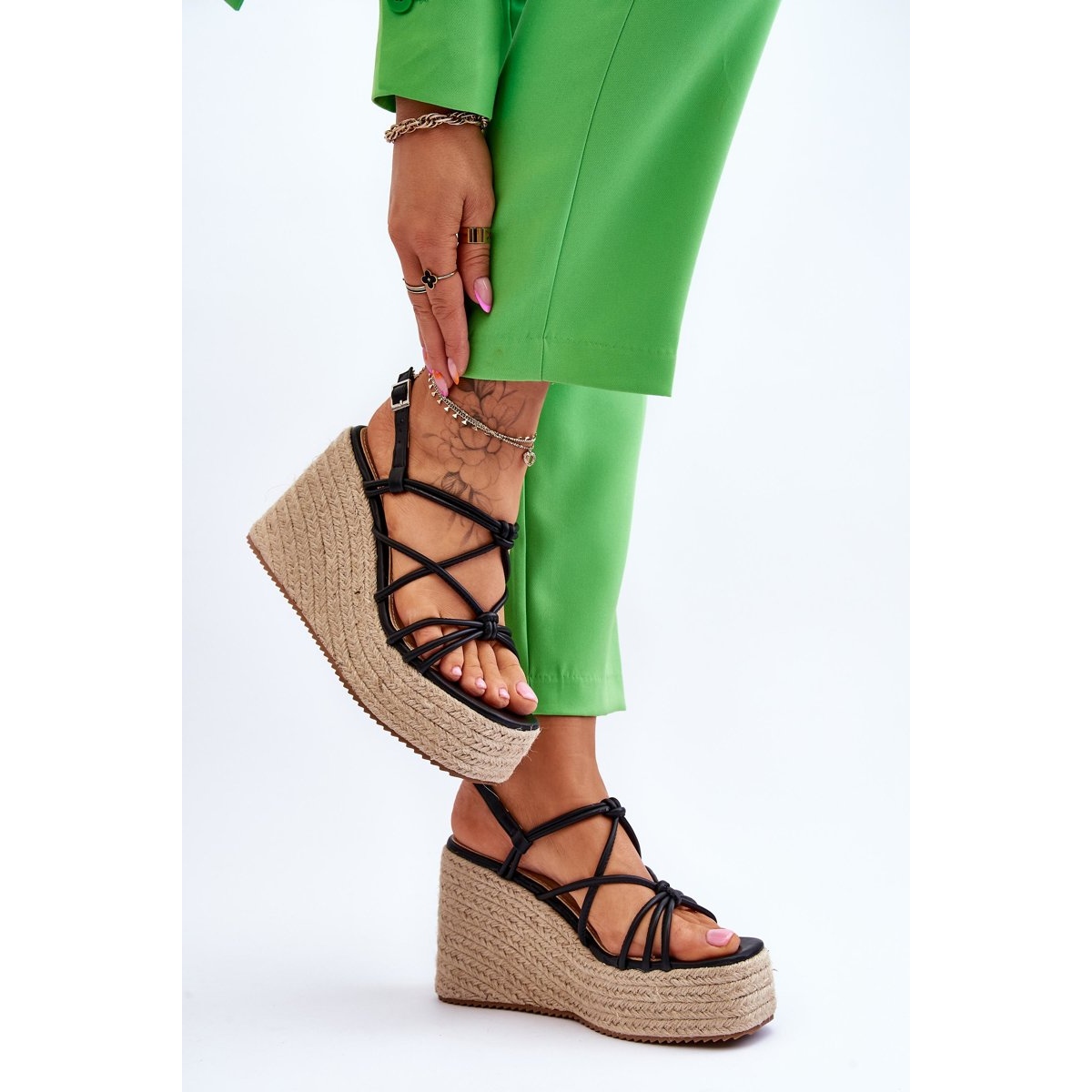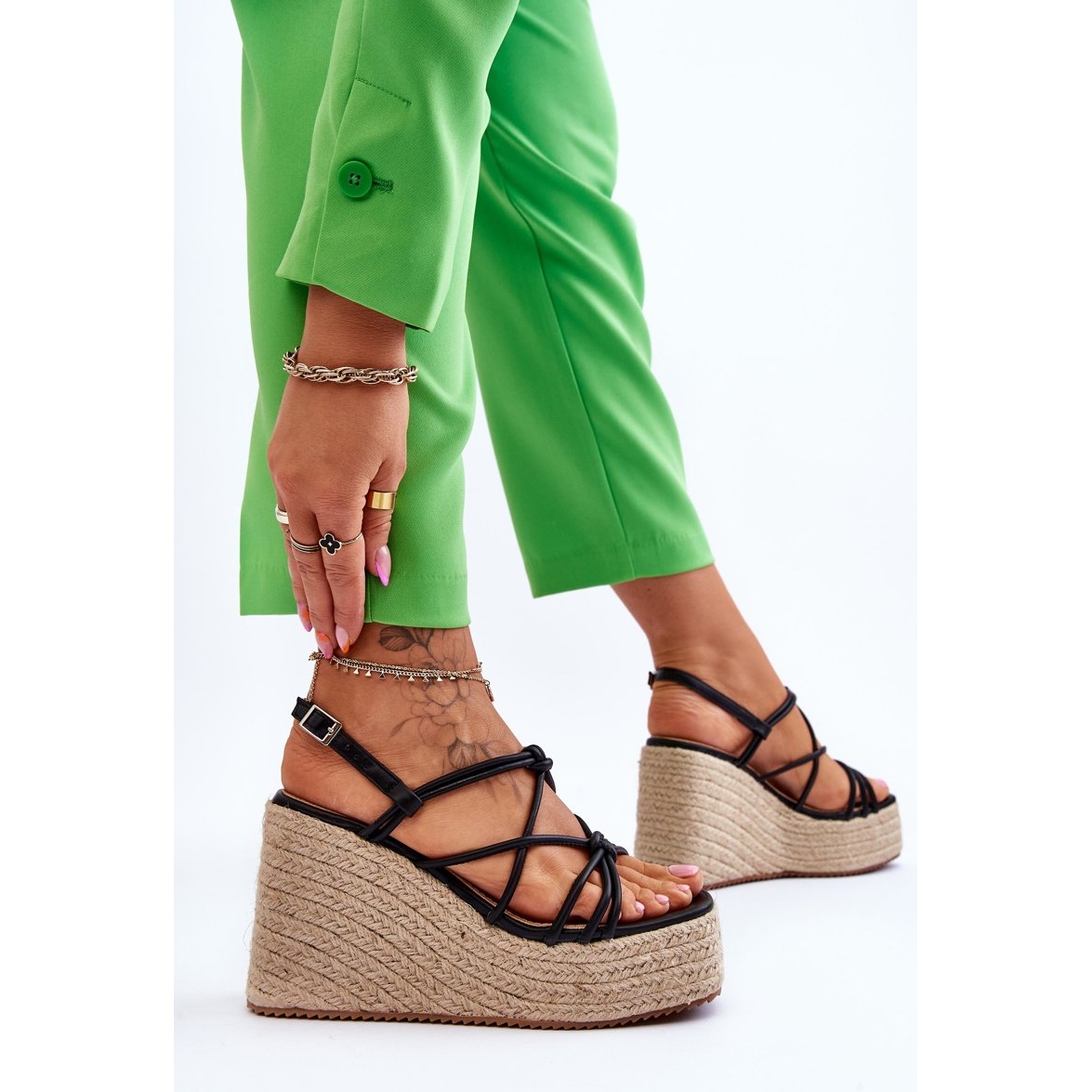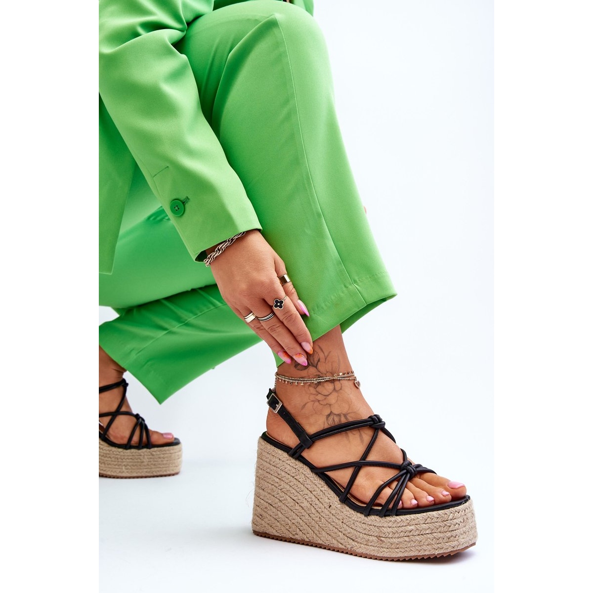 Les sandales sont fixées autour de la cheville à l'aide d'une boucle réglable, ce qui permet un ajustement parfait à n'importe quelle jambe. Une semelle en plastique avec rainures et une cale ornée d'un galon de jute sont des éléments qui attirent l'attention et soulignent le caractère unique de ces chaussures.