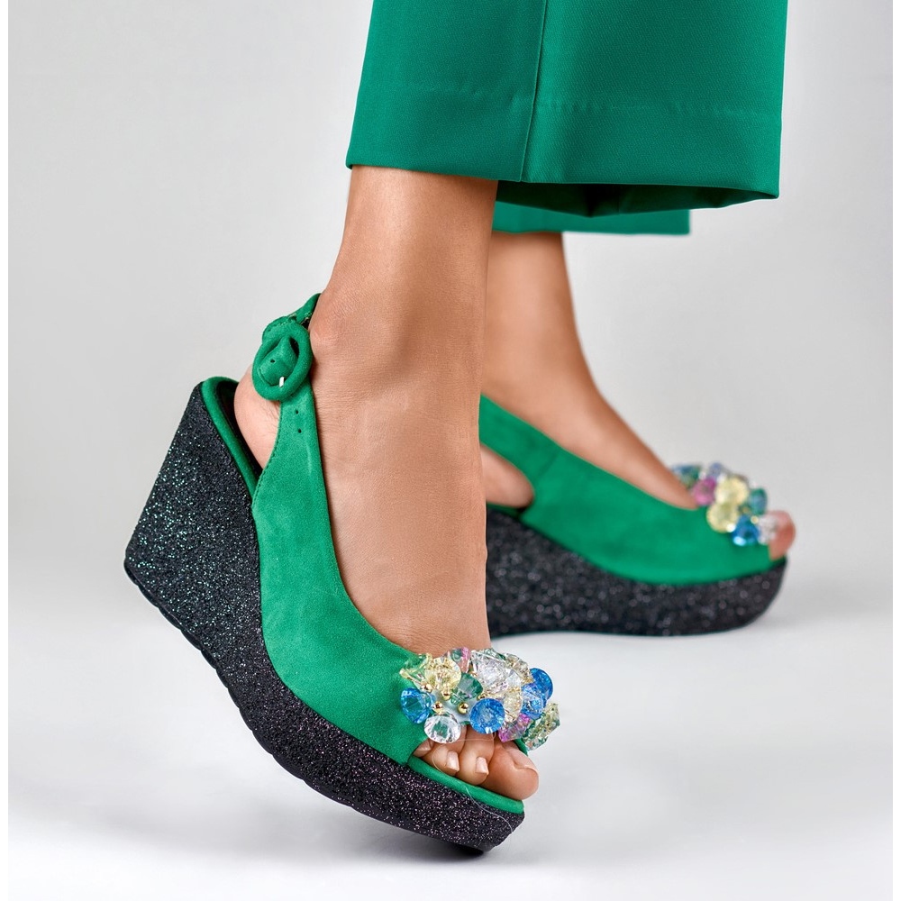 Fabriquées en daim écologique, les sandales se caractérisent par des matériaux de haute qualité. Le nez ouvert et la coupe classique mettent parfaitement en valeur la silhouette féminine, et la couleur verte ajoutera de la fraîcheur à n'importe quel style. La hauteur de la plateforme de 8 cm assure un confort de marche, et des strass supplémentaires attirent l'attention et confèrent aux chaussures un caractère unique.