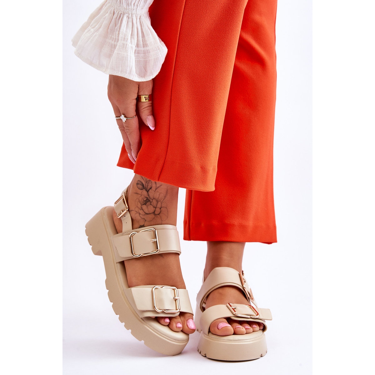 Le confort de port est assuré par des semelles intérieures souples en cuir écologique et un talon plat de 4,5 cm de haut combiné à une plateforme de 2,5 cm de haut, qui assure la stabilité et soulage le pied. La fermeture délicate autour de la cheville avec une bride réglable à boucle carrée facilite l'ajustement de la sandale à la circonférence individuelle de la cheville et leur donne un look caractéristique.