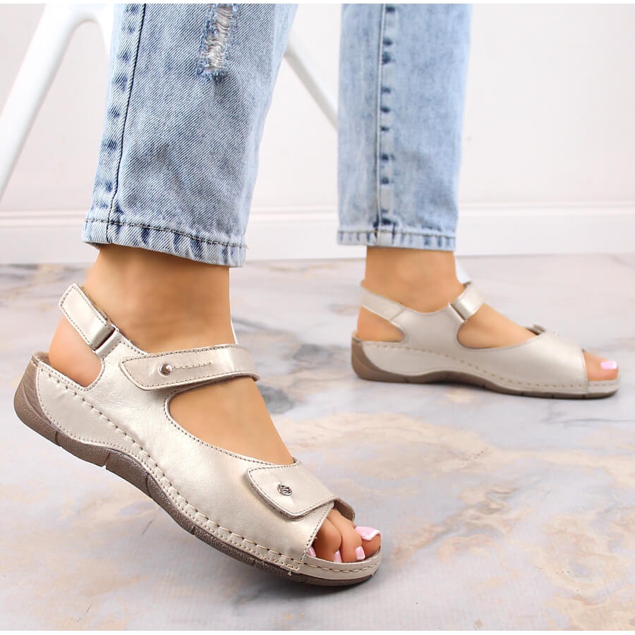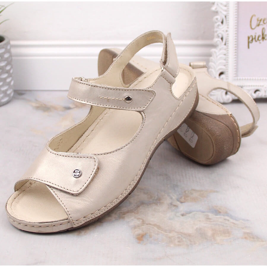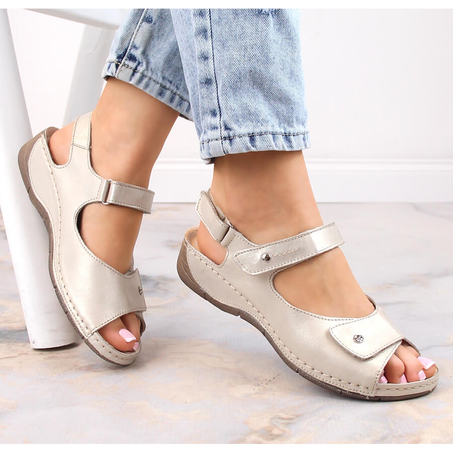 Les sandales fermeture scratch dorées en cuir confortables pour femmes Helios 266-2 sont la quintessence de l'élégance alliée à un confort incroyable. Fabriquées en Pologne, ces sandales élégantes séduisent par leur couleur dorée et leur excellente finition, caractérisée par l'utilisation de cuir naturel tant à l'extérieur qu'à l'intérieur de la chaussure.