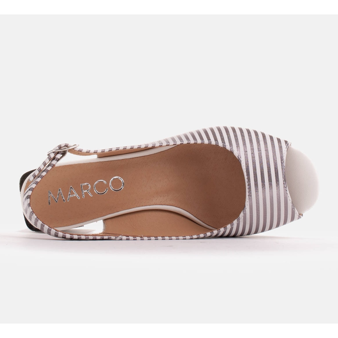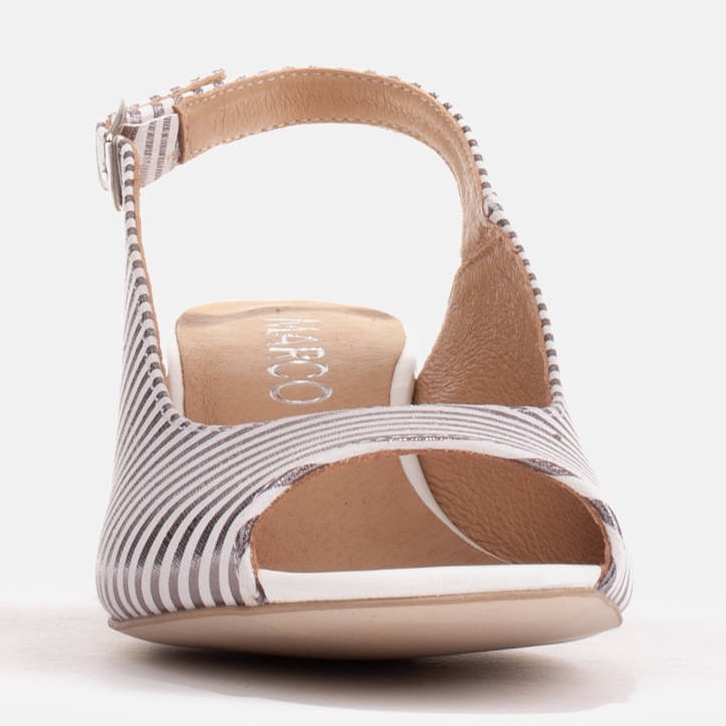 Marco Shoes présente des sandales pour femmes élégantes et confortables qui attirent l'attention avec leurs couleurs intéressantes et leur finition en cuir grainé naturel. Le modèle se caractérise par une combinaison de blanc avec des accents multicolores et des détails argentés, ce qui confère aux chaussures un caractère unique mais universel, assorti au style estival.