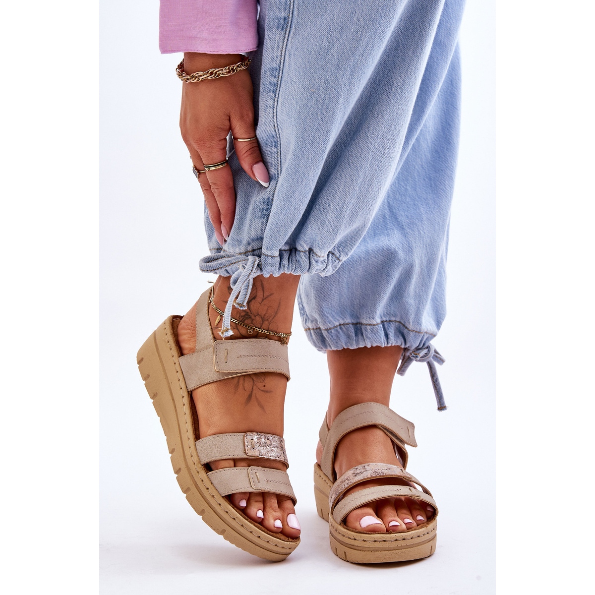 Classic, léger et extrêmement confortable Sandals Vinceza Fresh Look To Have Have pour la saison printemps / été. Fabriqué en cuir écologique de haute qualité dans une couleur beige élégante, réglée sur un coin stable d'une hauteur de 5 cm avec une plate-forme de 3 cm. La coupe ouverte avec un manque de nez et une fixation fermeture scratch réglable offre un confort et une correspondance parfaite quotidiennement.