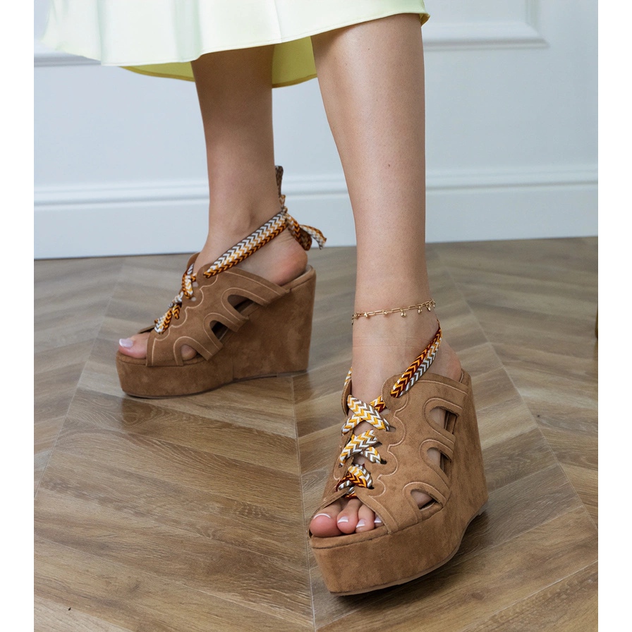Vobuez avec des sandales brunes au coin du modèle de laçage décoratif J20085, qui est une combinaison parfaite d'élégance et de confort. Ces sandales uniques sont incontournables dans la garde-robe d'été de toutes les femmes à la mode!