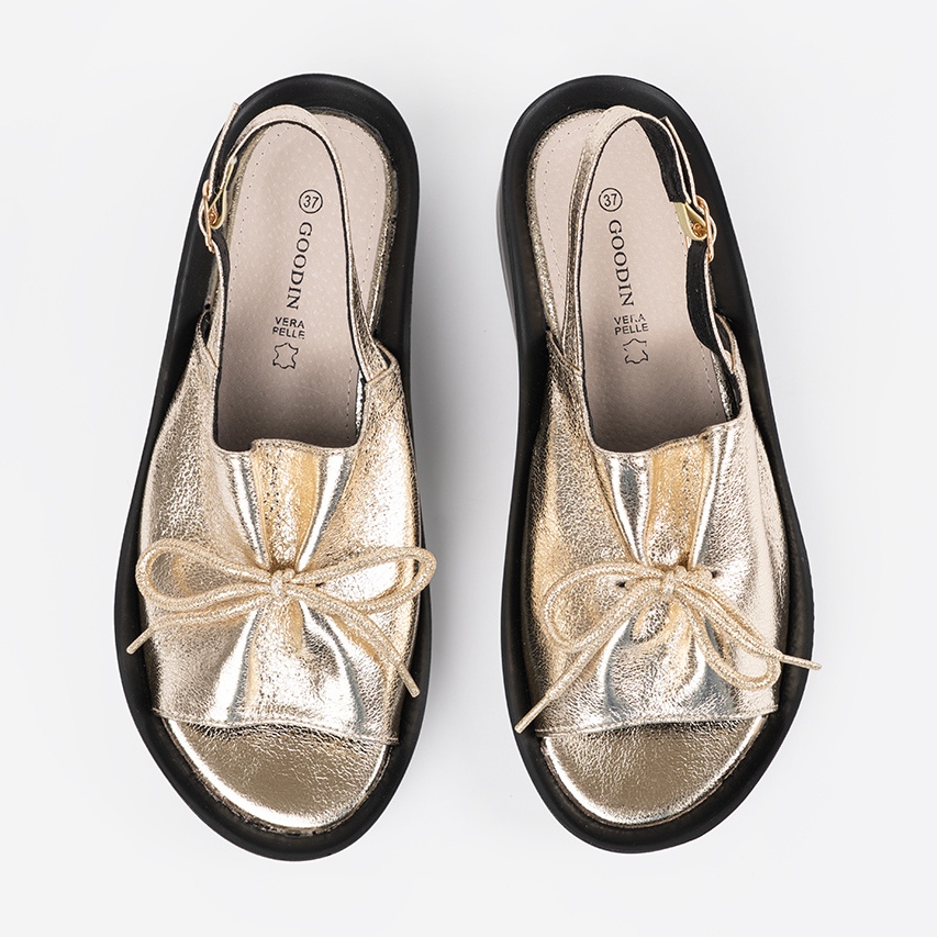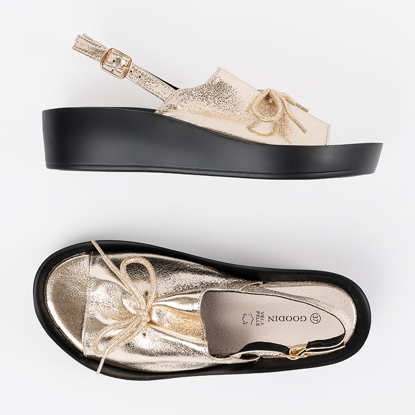 Les sandales de coin dorées du fabricant Goodin sont la combinaison parfaite d'élégance et de confort pour une femme moderne. Fabriqués en insert en cuir de haute qualité, ils offrent du confort toute la journée. La partie extérieure de la chaussure est un daim écologique, qui leur donne un look unique et élégant.