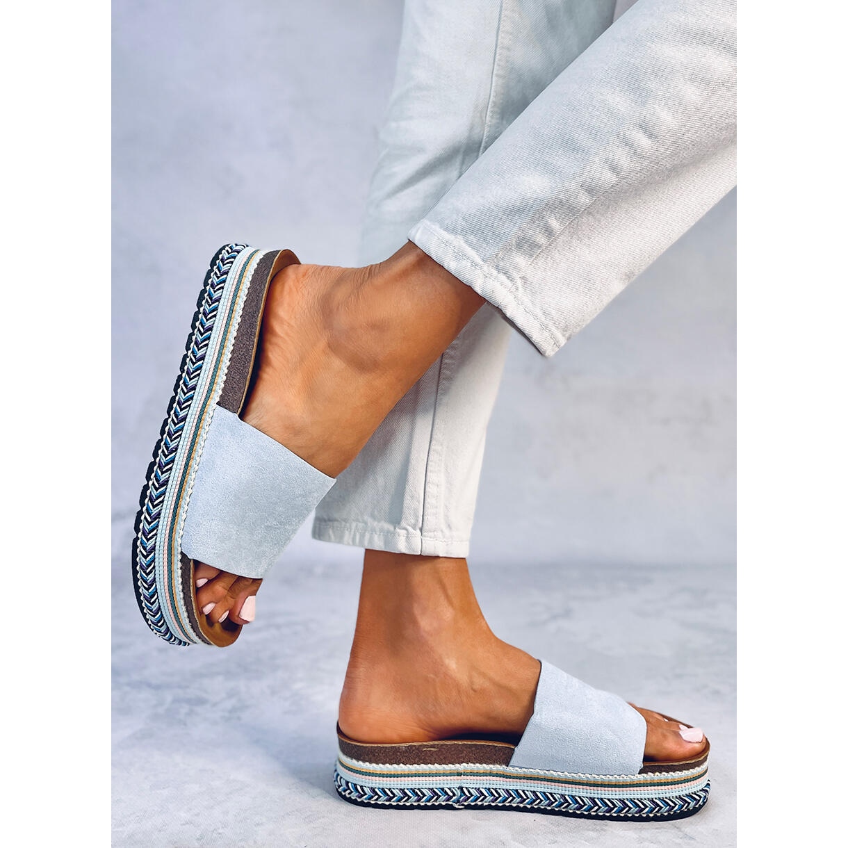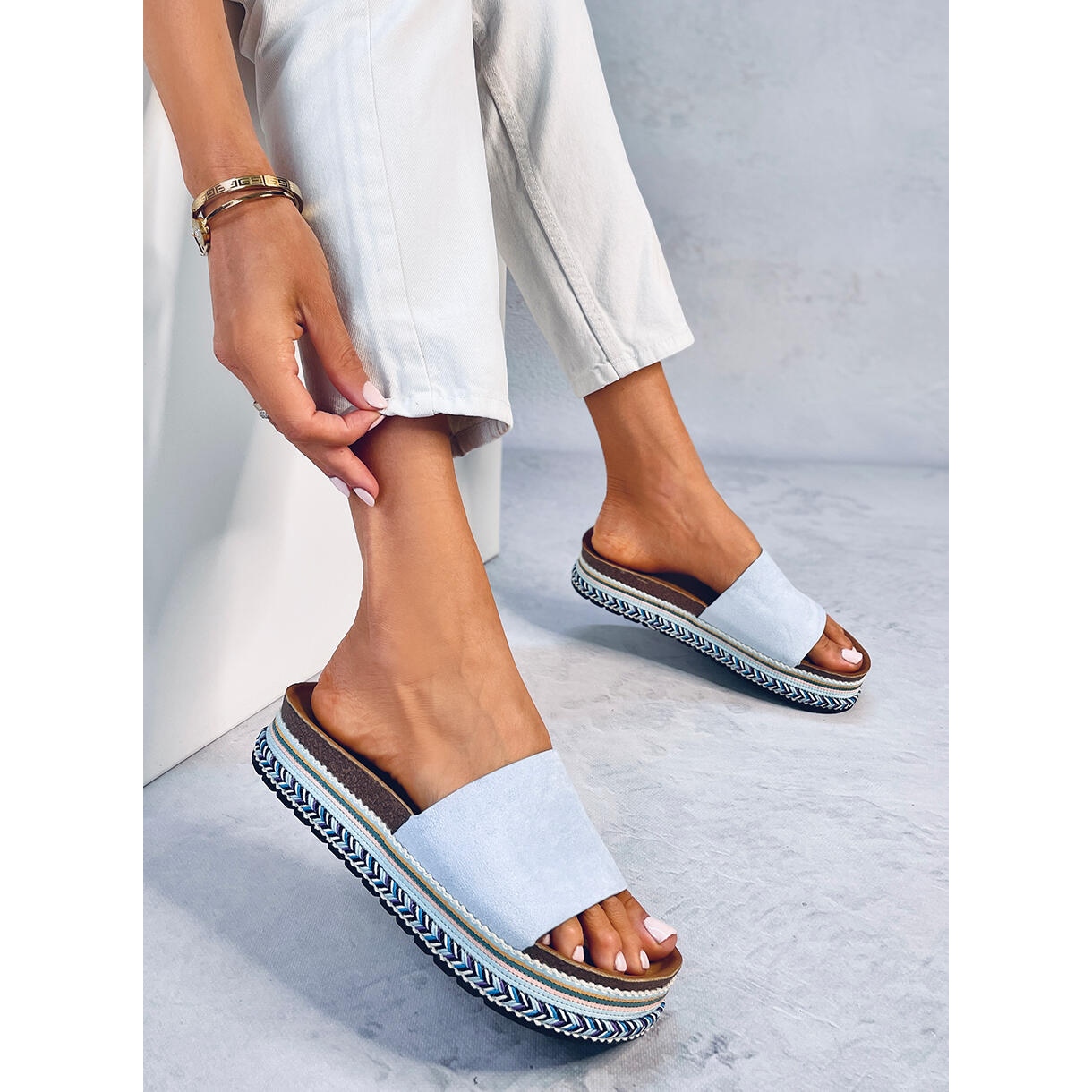 Les tongs Demou Blue avec une semelle décorée peuvent être facilement intégrées à une tenue décontractée (de tous les jours), ajoutant une pincée de style unique. La surface lisse des tongs d'une belle couleur bleue se marie parfaitement avec les robes, pantalons et jupes d'été.