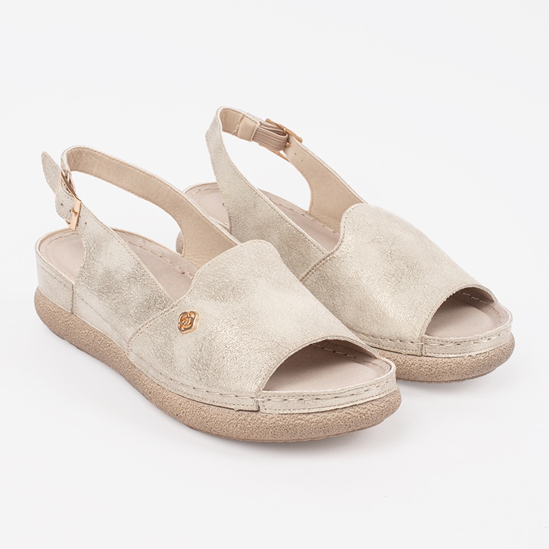 Ce modèle se distingue par un talon ouvert et par manque de nez, ce qui assure le confort et la liberté de porter. L'insert en cuir garantit non seulement une qualité, mais aussi le confort tout au long de la journée. Le matériau textile externe dans une nuance d'or métallique rend les chaussures élégantes et efficaces.