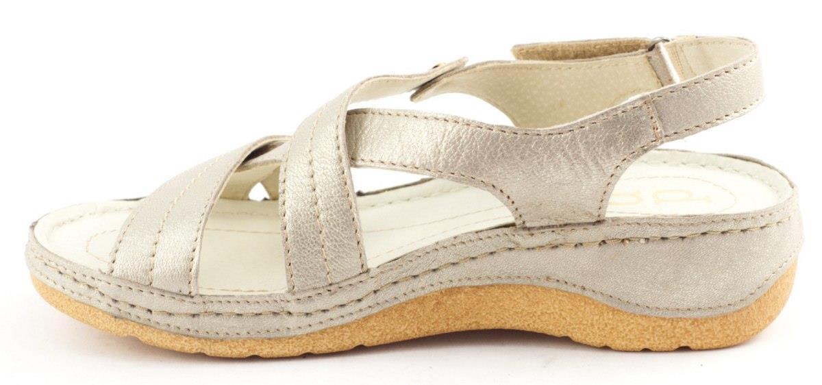 Le cuir naturel à l'extérieur et à l'intérieur garantit la durabilité, la bonne ventilation et le confort d'utilisation tout au long de la journée. Un coin magnifique mais stable fournit une certaine étape et un look élégant sans renoncer au confort. La couleur dorée fait que les sandales correspondent parfaitement aux robes d'été, aux pantalons capri ou aux jupes aérées, donnant un style de style.