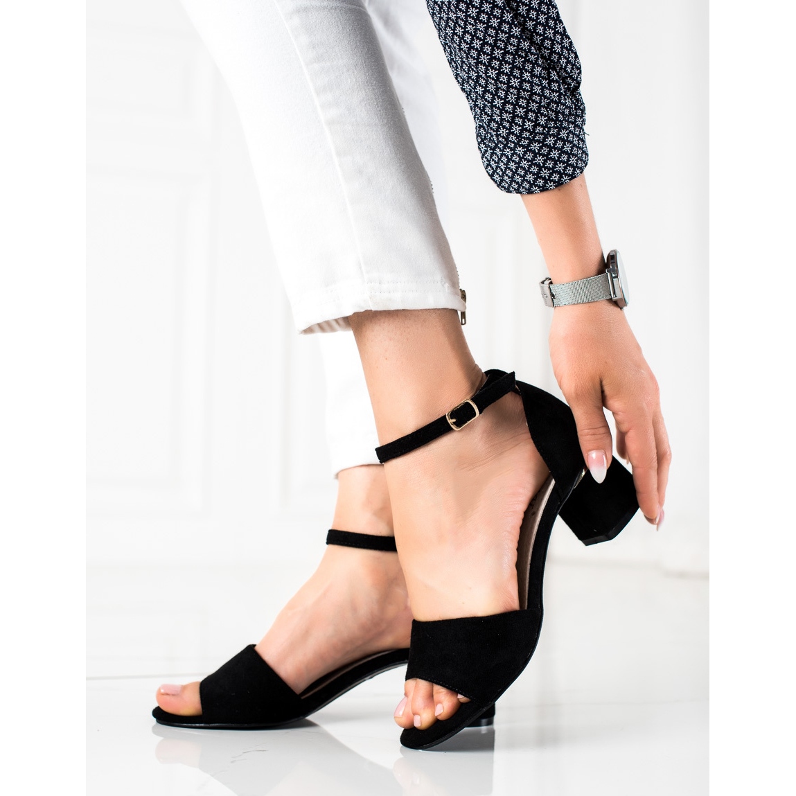 Ces sandales à talons ont été conçues avec une attention aux détails. Le talon effilé de 5 cm assure une silhouette élégante et un confort en toute situation. Fabriquées en daim écologique, les sandales s'adaptent parfaitement au pied et leur construction souple avec talon intégré les rend extrêmement confortables, même lorsqu'elles sont portées pendant de longues périodes.