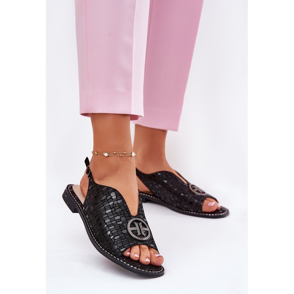 Détails: S.Barski Sandales en cuir à talons plates avec un ornement de S. Barski KV51-094 noir le noir