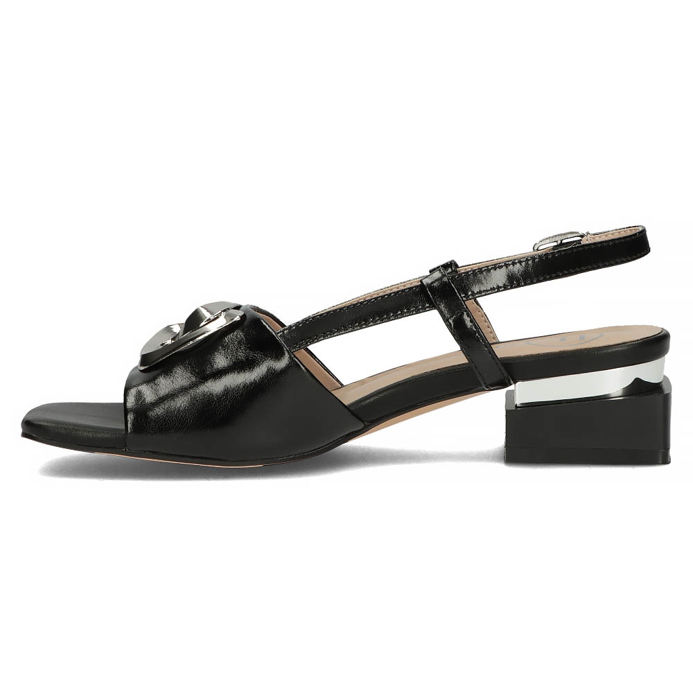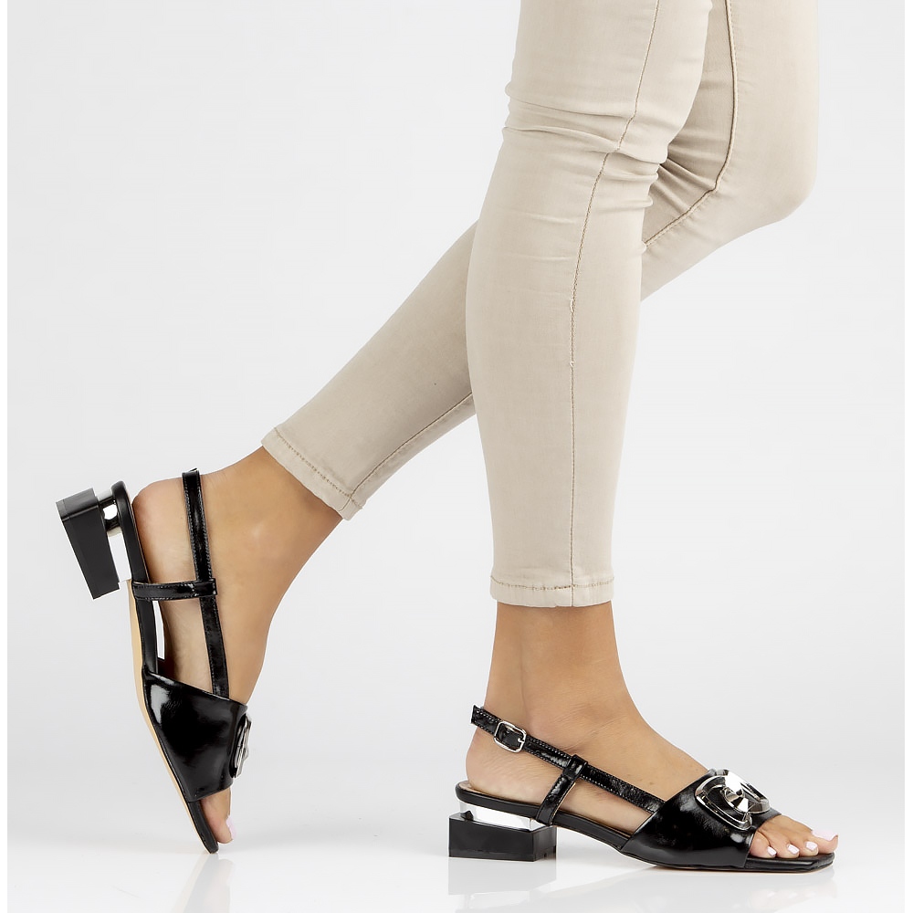 Les sandales sont dotées d'une boucle qui permet un enfilage facile et rapide et un ajustement aux besoins individuels. La semelle en plastique garantit légèreté et confort de port, et la faible hauteur de plateforme de 0,5 cm et le talon en forme de bloc de 3 cm de haut ajoutent de la stabilité à chaque pas.