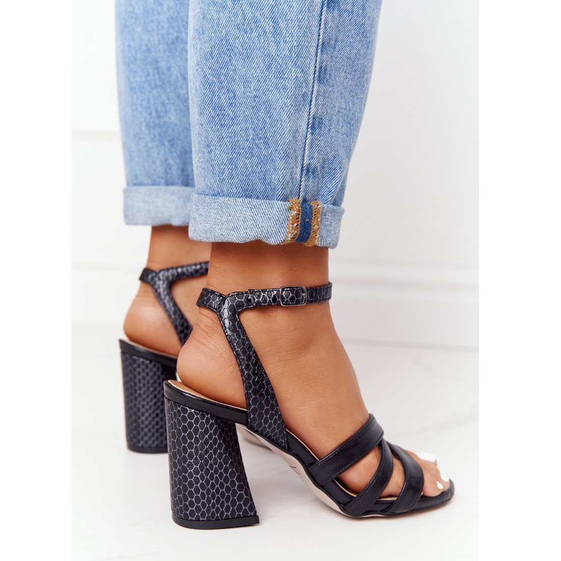 Les sandales noires se distinguent par un motif géométrique sur le talon, qui leur confère un caractère original. Le talon bloc de 9 cm de haut assure la stabilité et allonge en même temps optiquement les jambes. La fermeture à boucle rend les sandales non seulement fonctionnelles, mais aussi faciles à enfiler.