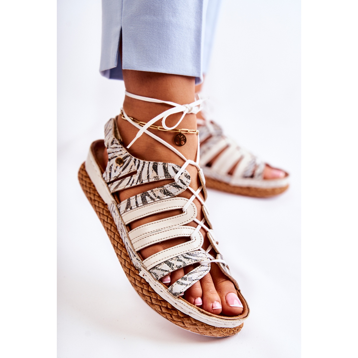 Les sandales sont montées sur une délicate cale de 4,5 cm de haut et une plateforme stable de 2,5 cm d'épaisseur. Cette conception ajoute non seulement de la minceur à la silhouette, mais offre également de la hauteur sans compromettre le confort. Le bout ouvert et arrondi favorise la ventilation du pied, ce qui fait de ce modèle un choix idéal pour les chaudes journées d'été.