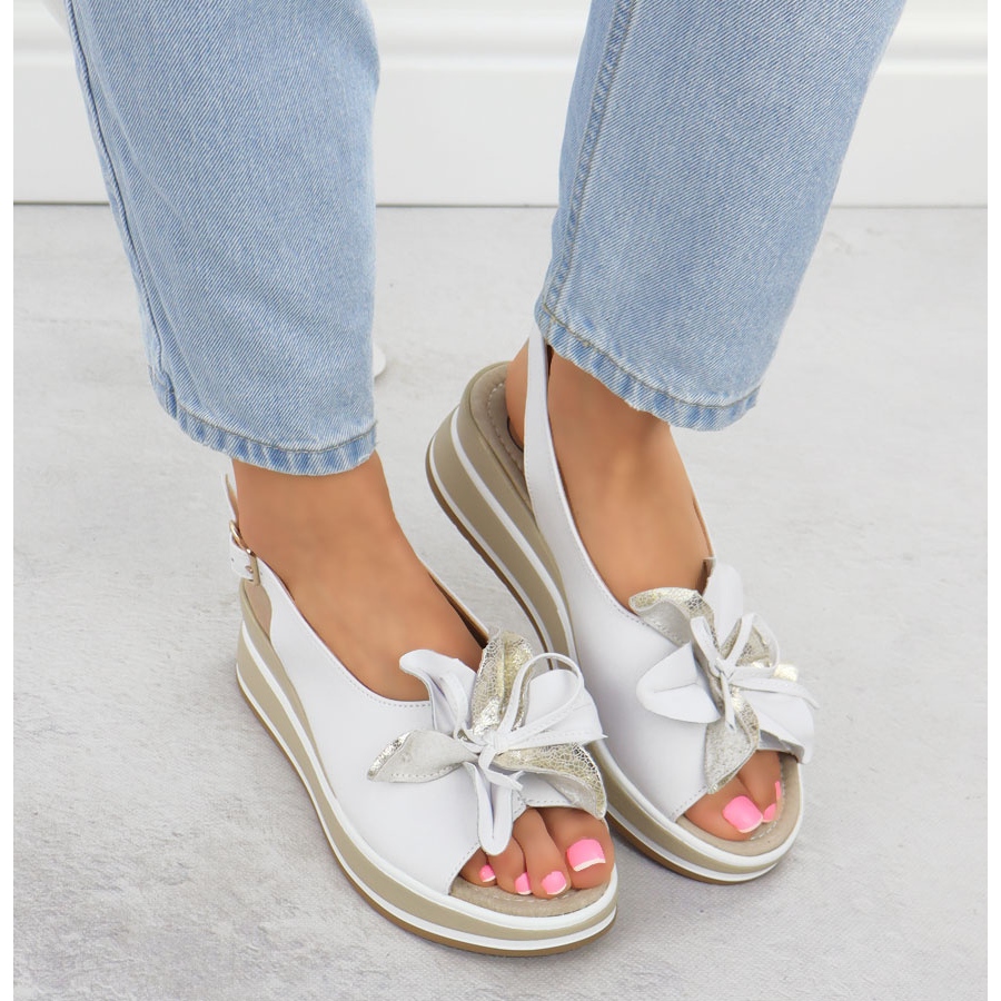 Ces sandales se caractérisent par une coupe classique qui ne se déroge jamais. En plus de détails subtils, comme une fleur élégante, leur couleur blanche les fait s'adapter à la fois des tenues décontractées et plus formelles. La hauteur du coin de 5 cm ajoute une croissance subtile, sans abandonner le confort du mouvement.