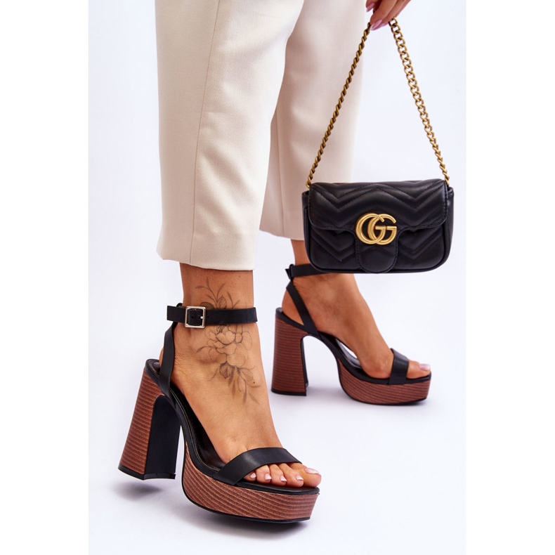 Sandales féminines élégantes et expressives en cuir écologique est une proposition idéale pour la saison printemps / été. Situé sur un talon de bar massif de 11,5 cm de haut avec une plate-forme de 3 cm, ils combinent un look à la mode avec le confort d'une structure stable. Le modèle a un nez carré ouvert et un talon ouvert, il est fixé avec une ceinture réglable avec une boucle.