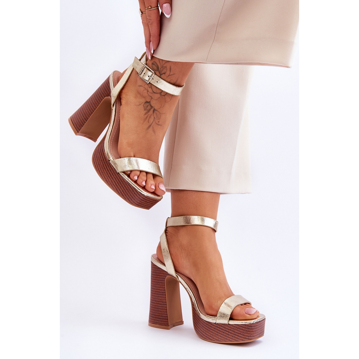 Sandales de marina élégantes et métalliques dans une nuance d'or, en cuir écologique de haute qualité. Situé sur un type de talon massif avec une plate-forme pratique, ils combinent un style féminin avec une commodité. Le modèle a un nez carré ouvert et un talon ouvert et une ceinture réglable avec une boucle - parfaite pour la saison printemps / été.