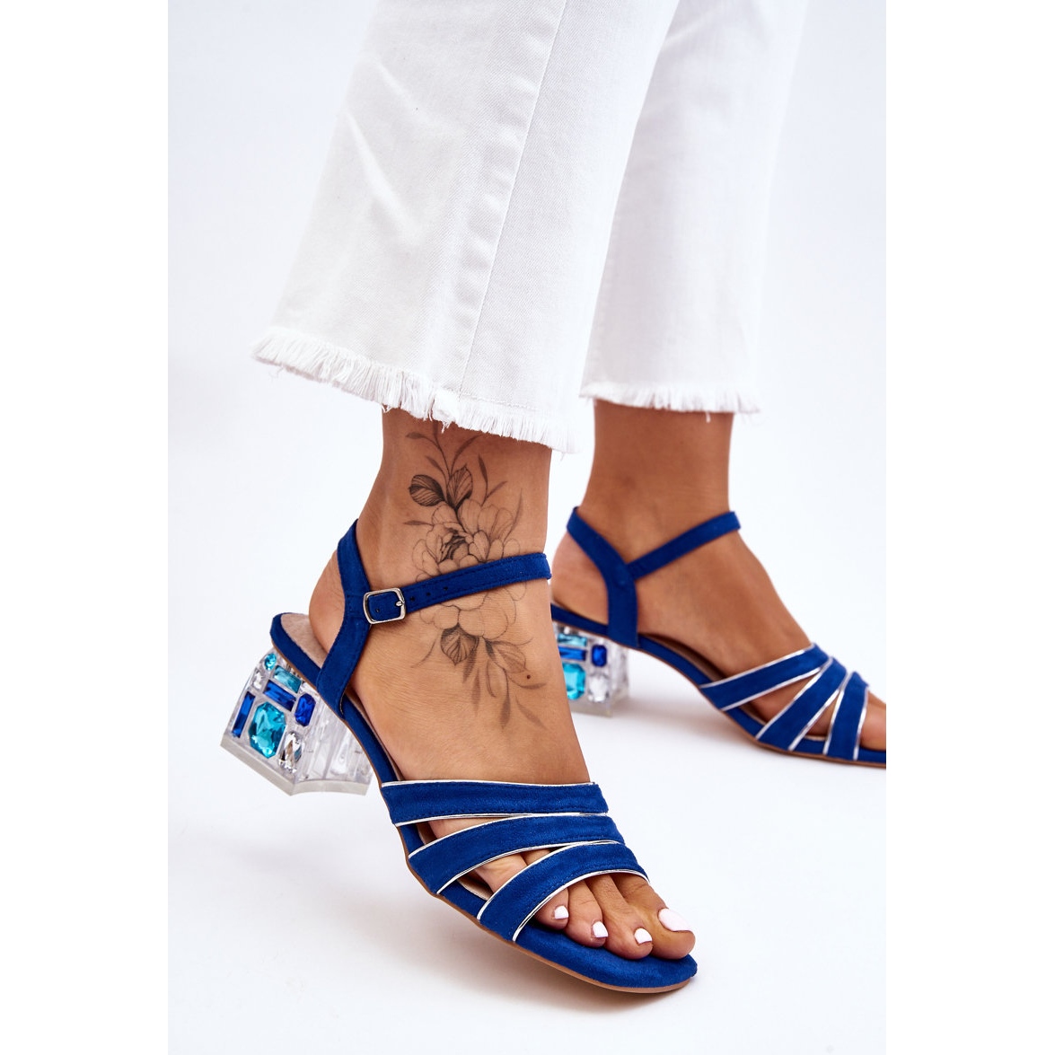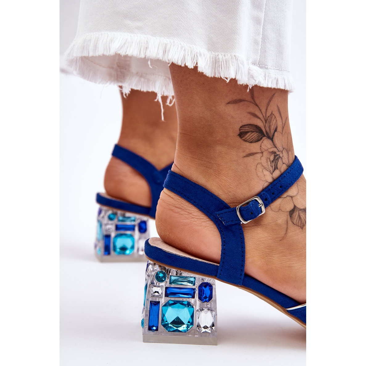 Nous vous présentons les phénoménales sandales S.Barski pour femme en bleu, modèle Callan, qui allient parfaitement élégance et confort. Ces sandales uniques sont fabriquées en éco-daim de haute qualité, ce qui les rend à la fois élégantes et respectueuses des animaux. Le bout carré ouvert leur confère un caractère moderne et de subtils cristaux incrustés dans le talon renforcent l'effet glamour.