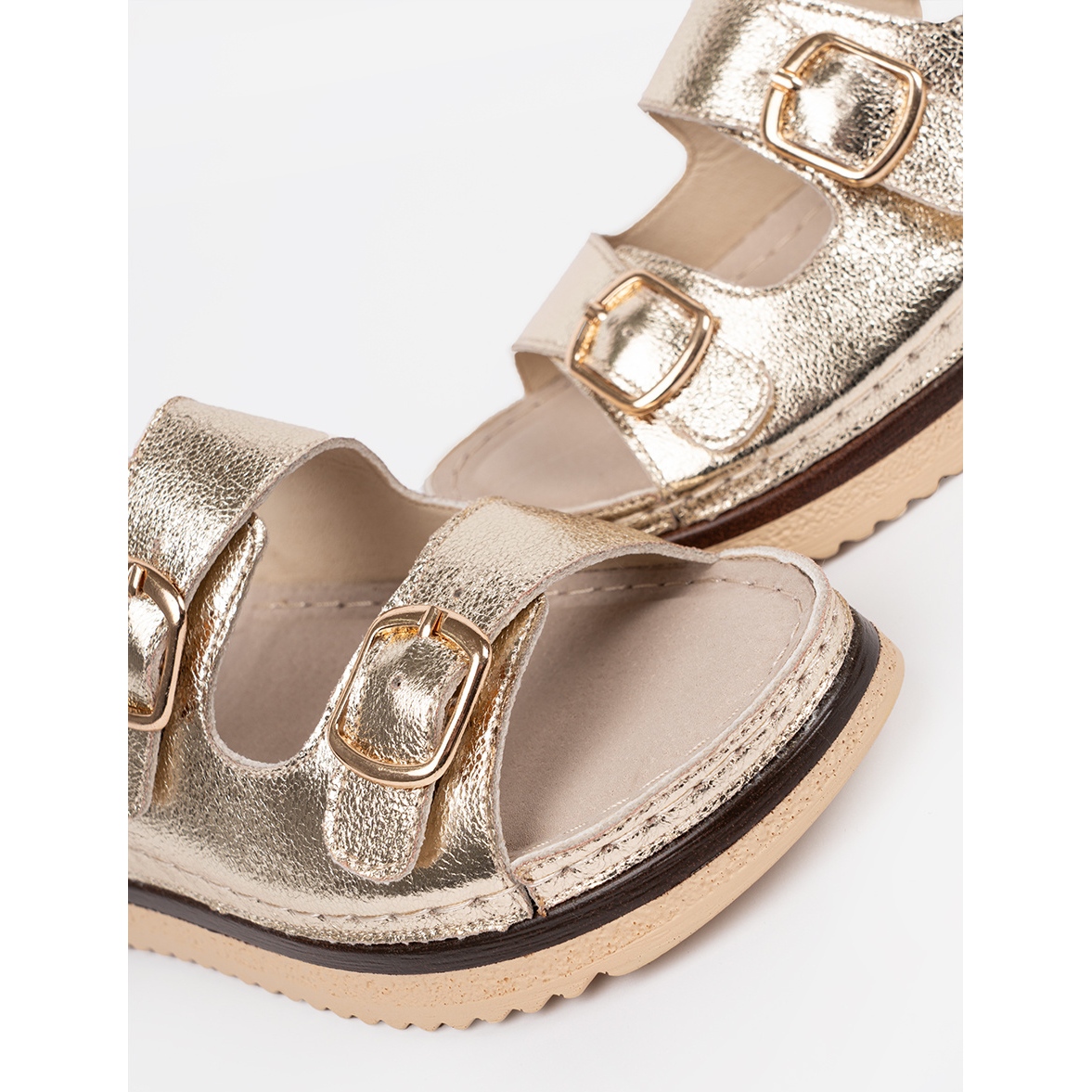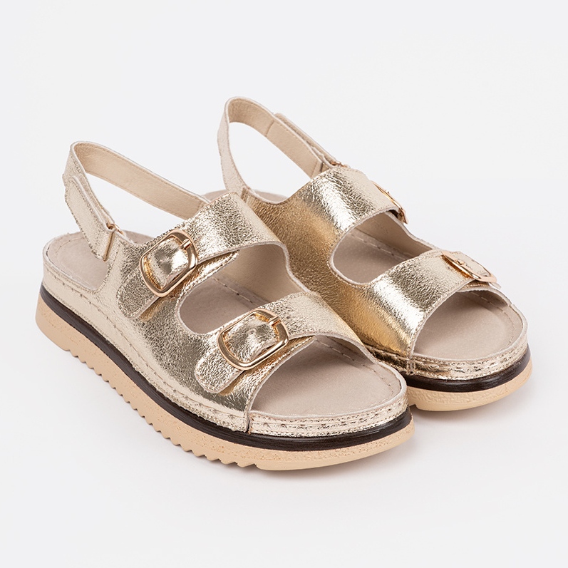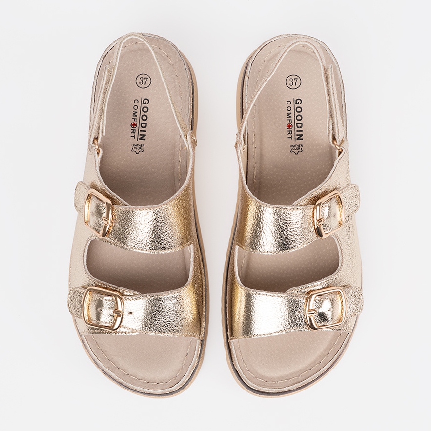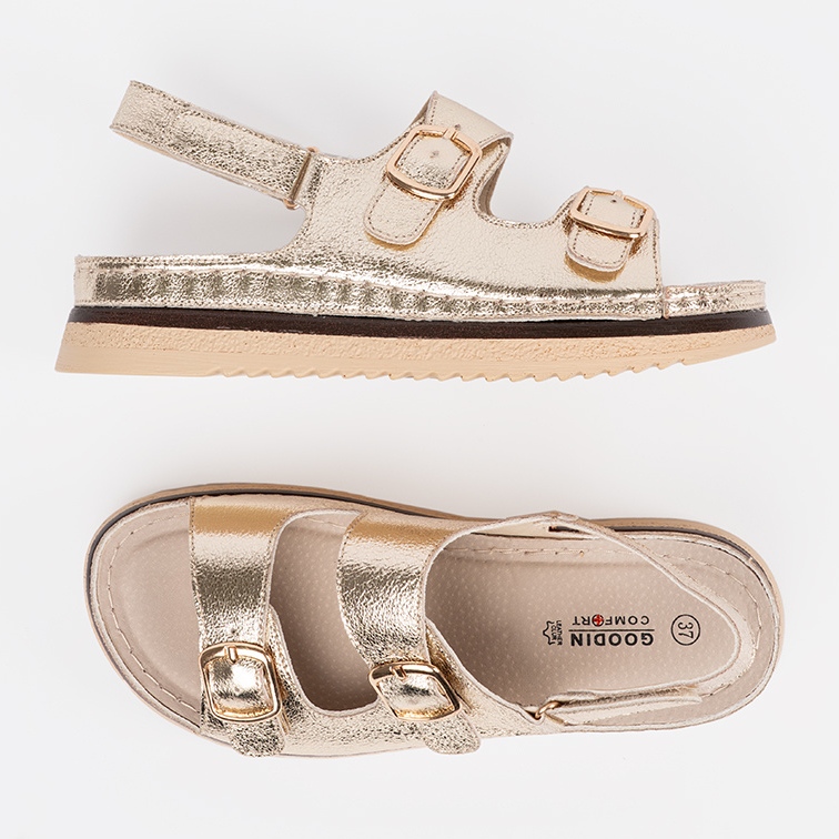 Les sandales en or Goodin avec des éléments dorés sont une excellente proposition pour chaque femme à la recherche de chaussures d'été élégantes et élégantes. Ces sandales uniques se distinguent par une finition métallique, ce qui leur donne un personnage moderne et élégant. Ils sont parfaits à la fois quotidiennement et pour des occasions plus formelles, créant un accent intéressant dans chaque stylisation de l'été.